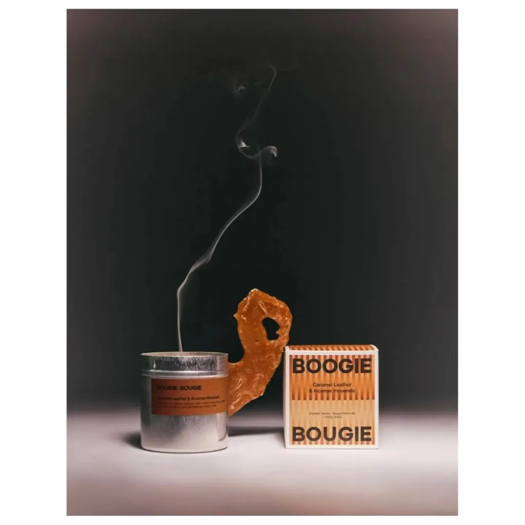 - Caramel Leather & Incense Innuendo, évoque une brume d’encens intrigante qui vient caresser le tableau de bord de la Chevrolet vintage, dont le moteur rugit. Entre sièges en cuir noir épais et usés et coupe glacée au caramel salé dans la main. Un moment olfactif inoubliable !