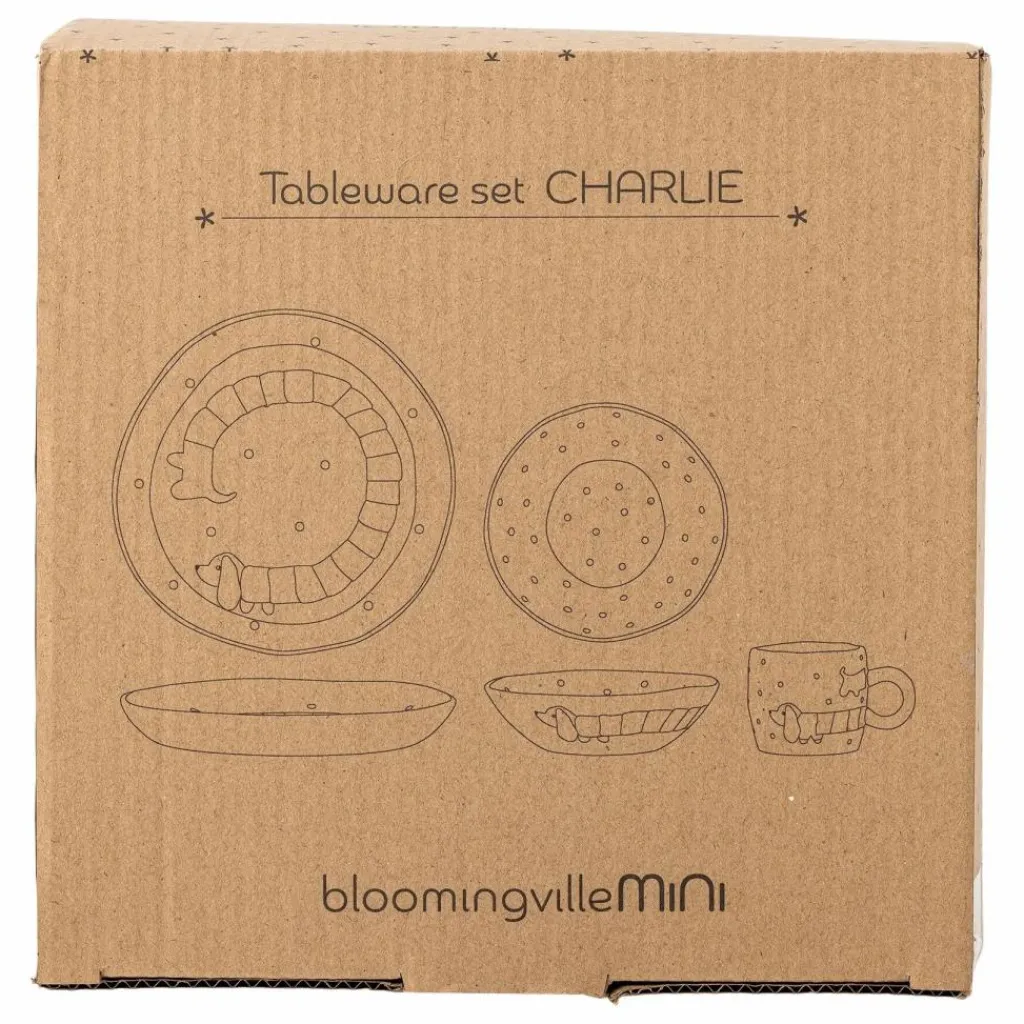 - Le Charlie Ensemble de Vaisselle de Bloomingville MINI apporte de la joie à la table avec son design ludique et coloré. L’ensemble comprend une tasse, un bol et une assiette, tous décorés d’un motif de chien mignon et de petits points dans des teintes douces. Il est parfait pour un usage quotidien et apportera sans aucun doute des sourires tant chez les enfants que chez les adultes. Le service de vaisselle est en grès.