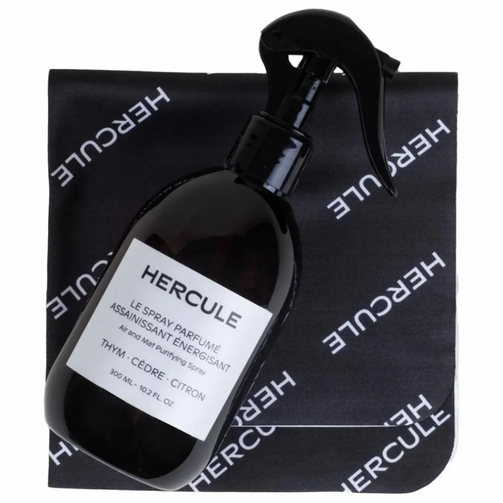 - Ce spray parfumé pour tapis de sport Hercule Studio est formulé à base d’huiles essentielles naturelles à 95% et d’alcool de blé bio. Son flacon et son étui sont 100% recyclables. Fabriqué en France.
