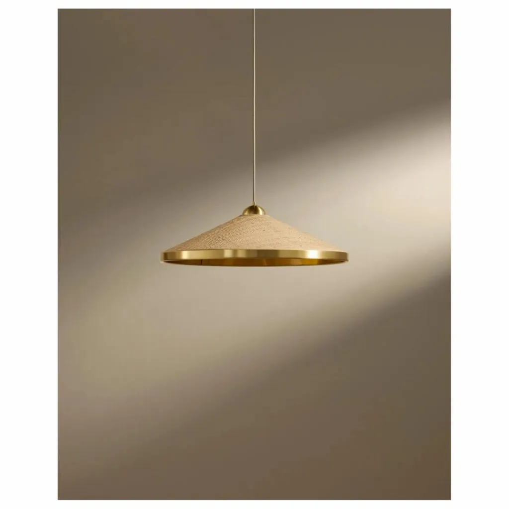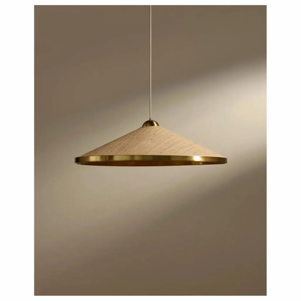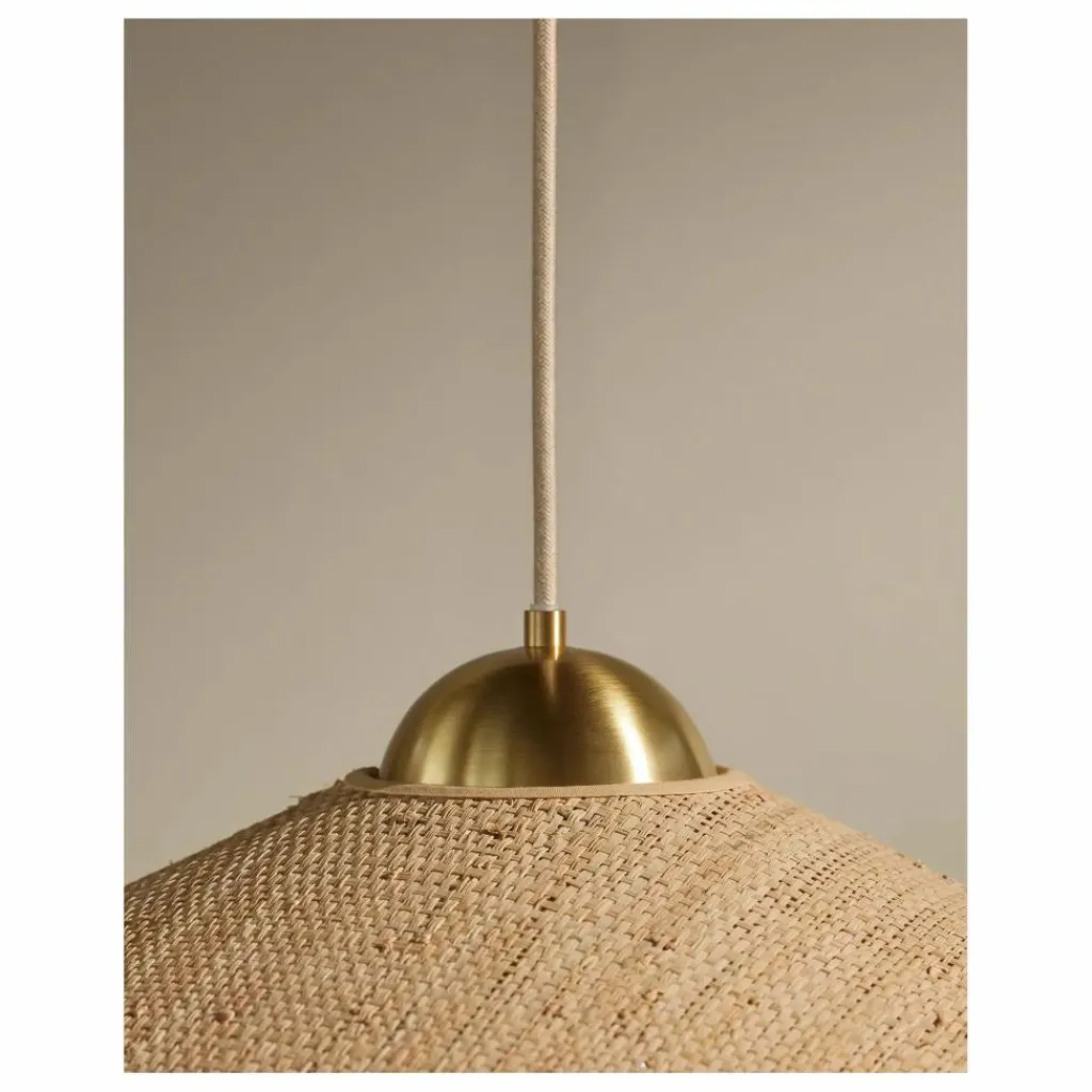 A un fil. Lever les yeux vers le plafond. C’est le réflexe provoqué par la suspension Songe. La délicate création se déploie dans les airs, revêtue d’une combinaison de rabane, de coton et de laiton. Un chic trio de matières — clin d’œil aux tables de bistrot parisien.