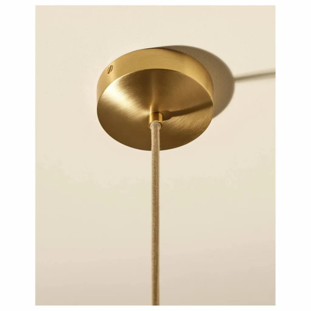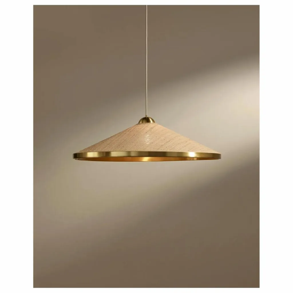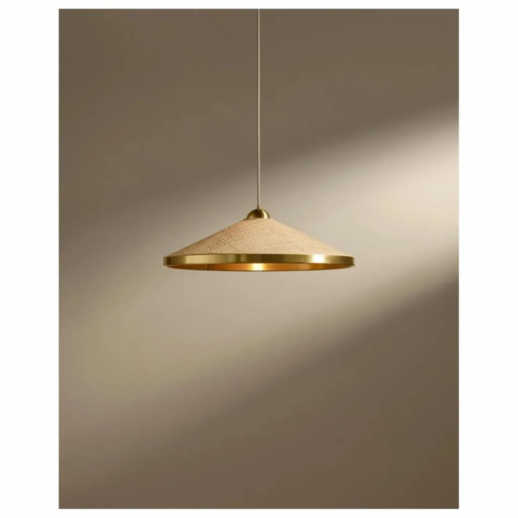 A un fil. Lever les yeux vers le plafond. C’est le réflexe provoqué par la suspension Songe. La délicate création se déploie dans les airs, revêtue d’une combinaison de rabane, de coton et de laiton. Un chic trio de matières — clin d’œil aux tables de bistrot parisien.