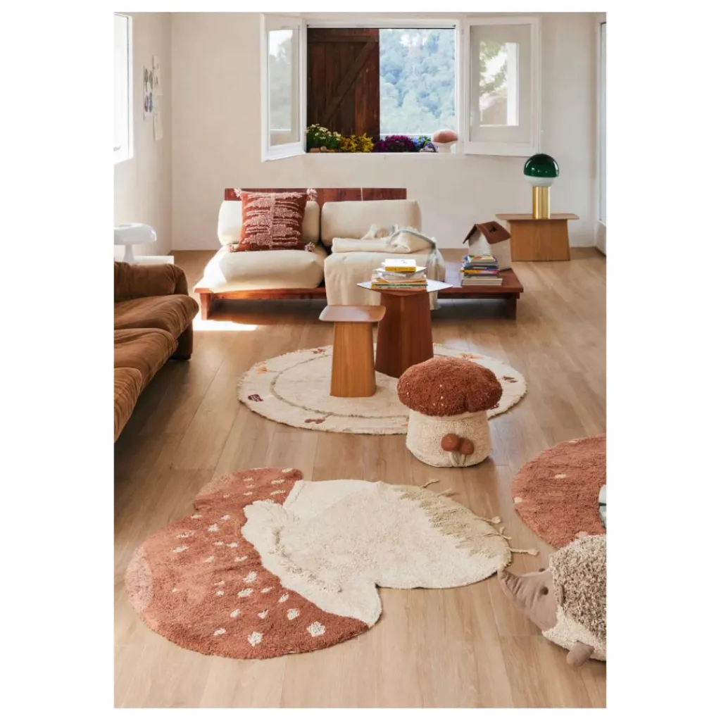 - Un tapis en coton en forme, montrant un gros champignon et un plus petit, touffeté en doux velours de coton naturel combiné aux couleurs châtaigne et olive. Les points sont légèrement irréguliers, réalisés selon la technique chenille. Des rangées de poils légèrement plus longs et des tresses ajoutées au bas donnent la touche supplémentaire à ce charmant tapis.Un tapis en coton en forme, montrant un gros champignon et un plus petit, touffeté en doux velours de coton naturel combiné aux couleurs châtaigne et olive. Les points sont légèrement irréguliers, réalisés selon la technique chenille. Des rangées de poils légèrement plus longs et des tresses ajoutées au bas donnent la touche supplémentaire à ce charmant tapis.