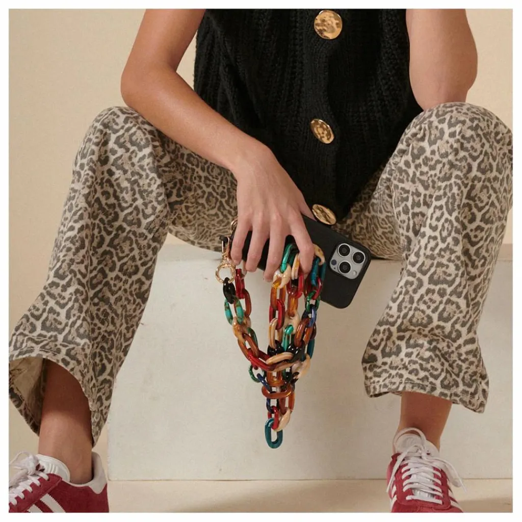 - Notre iconique chaîne « Ambre » – 120 cm, ornée de maillons multicolores en résine ultra résistante et de mousquetons dorés, médaille gravée « LCF ».