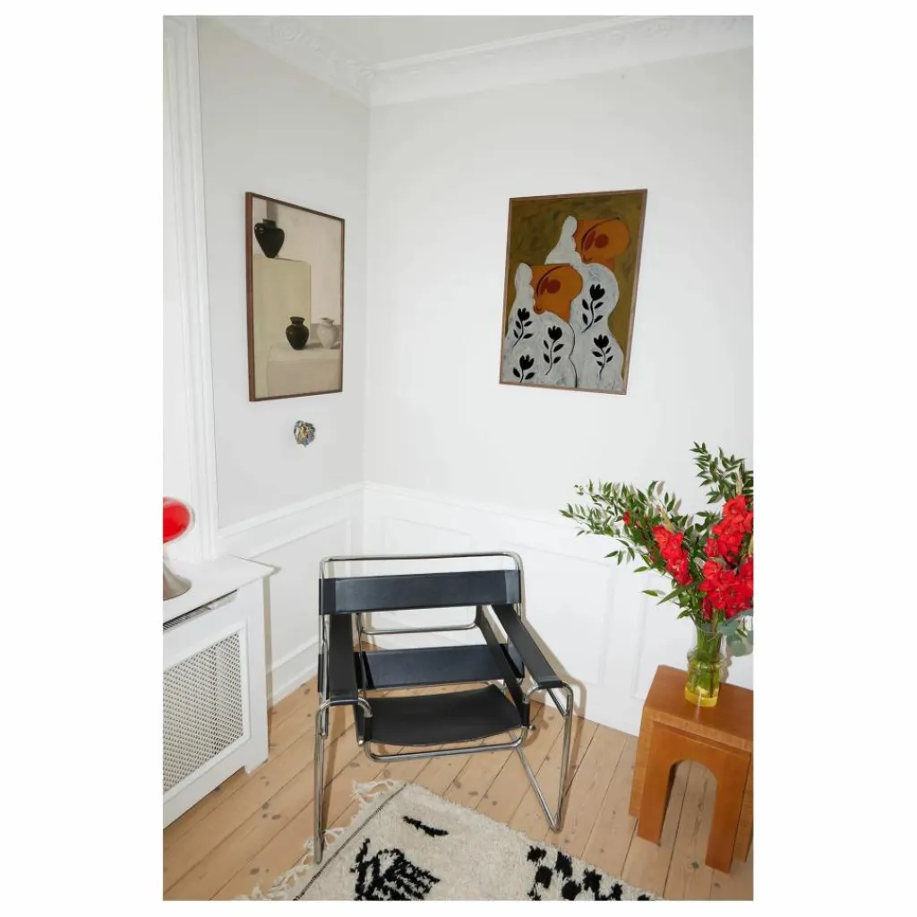 - Panna Cotta de l’artiste Sara Mai, basée à Copenhague, met en scène deux sujets liés par un moment de bonheur. Les deux figures abstraites semblent unies par un repas partagé, leurs visages s’illuminant. Créées grâce à une riche utilisation de peinture acrylique sur toile, les tonalités vertes et brunes profondes sont ponctuées de cheveux blancs avec des motifs floraux.
