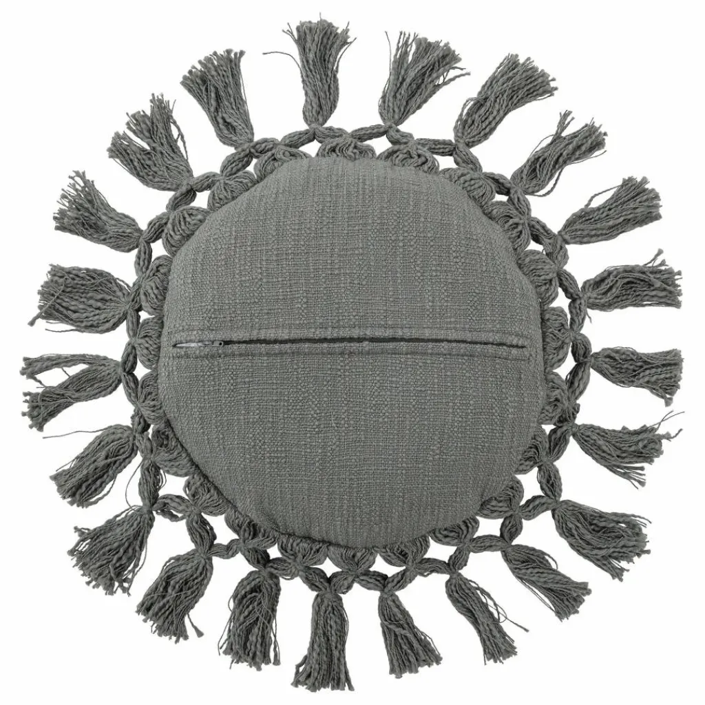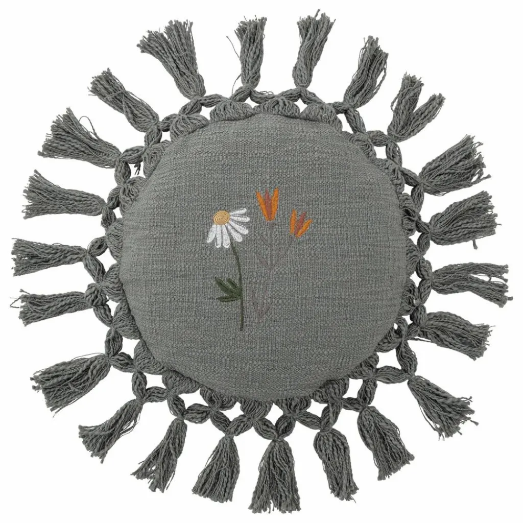 - Le Coussin Elinna de Bloomingville MINI est de forme ronde et bordé de grands glands tout autour. Il est d’une jolie couleur grise avec des fleurs au milieu. Le Coussin est en coton recyclé et s’intègre parfaitement dans une chambre d’enfant ou une serre.