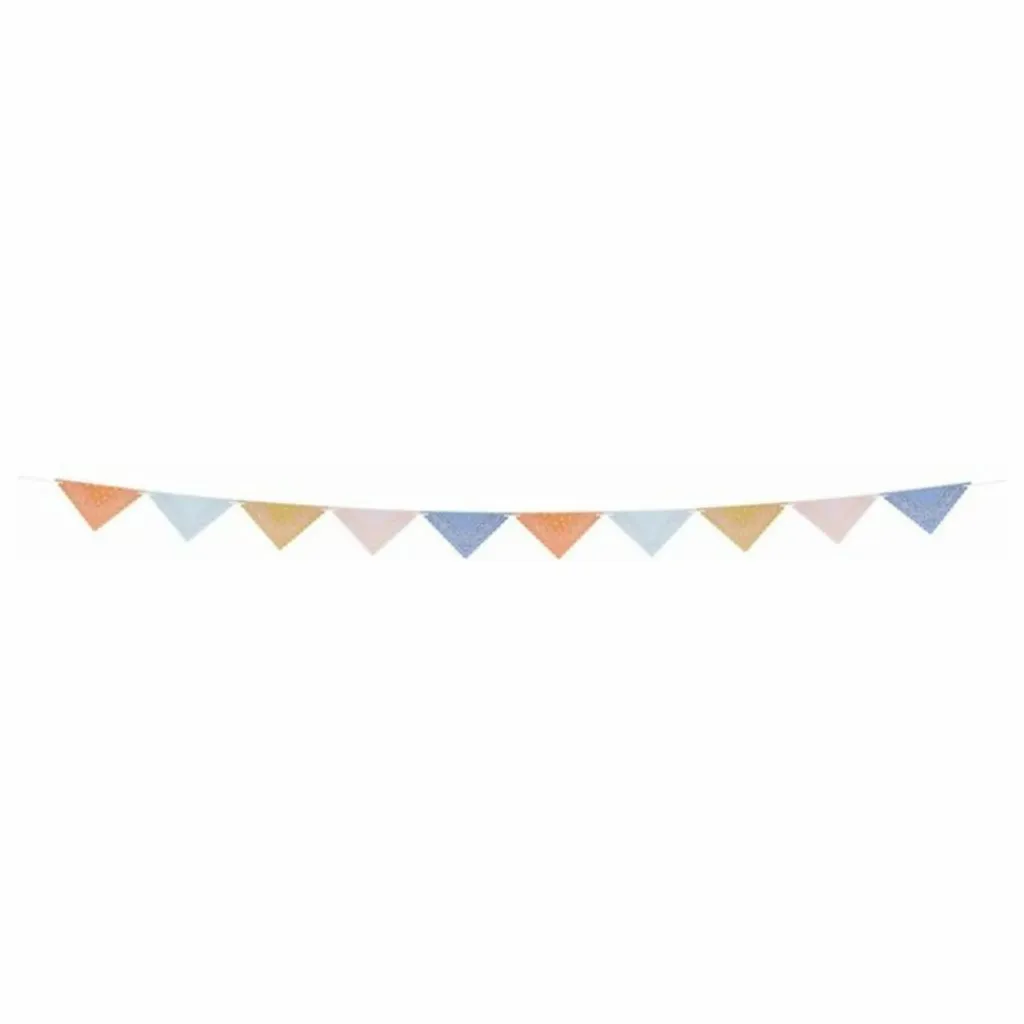 - Guirlande en papier composée de 10 fanions de cinq couleurs, dont orange, menthe, ocre, rose pâle et bleu. Corde torsadée naturelle.