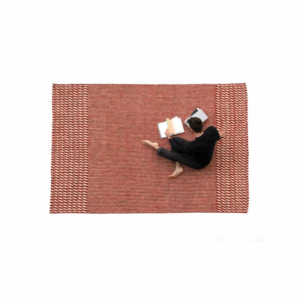 Les formes géométriques et la répétition sont les caractéristiques des frères Bouroullec. Leur maîtrise, leur minutie et leur capacité inépuisable à aller toujours plus loin les ont amenés à travailler sur Blur, une collection proposant deux lectures différentes. Lorsque vous observez le tapis de loin, vous remarquerez une surface indéfinie et non focalisée qui donne son nom à la collection. Néanmoins, à l’approche du tapis, des lignes et des losanges rythmiques de proportions différentes sont révélés, dans le plus pur style cinétique. Cet effet flou a été obtenu en inversant le sens dans lequel les kilims sont traditionnellement tissés, ce qui rend le tissage beaucoup plus complexe. Ce changement de tissage rend les lignes floues, mélangeant deux couleurs de manière inégale, créant un tapis vieilli rappelant le passé.