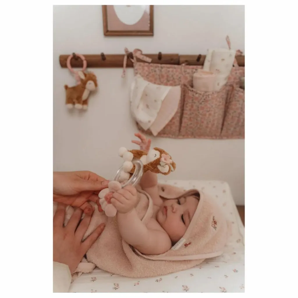 - Cet adorable faon, avec sa fourrure douce et sa petite fleur à caliner, stimulera l’éveil des sens de votre bébé. L’anneau transparent contient 3 petites perles colorées qui produisent un doux cliquetis pour stimuler l’ouïe de votre enfant. Ce hochet faon éveillera la curiosité et les sens de votre bébé, tout en favorisant sa coordination main-œil.