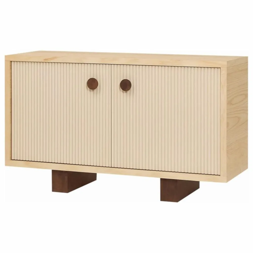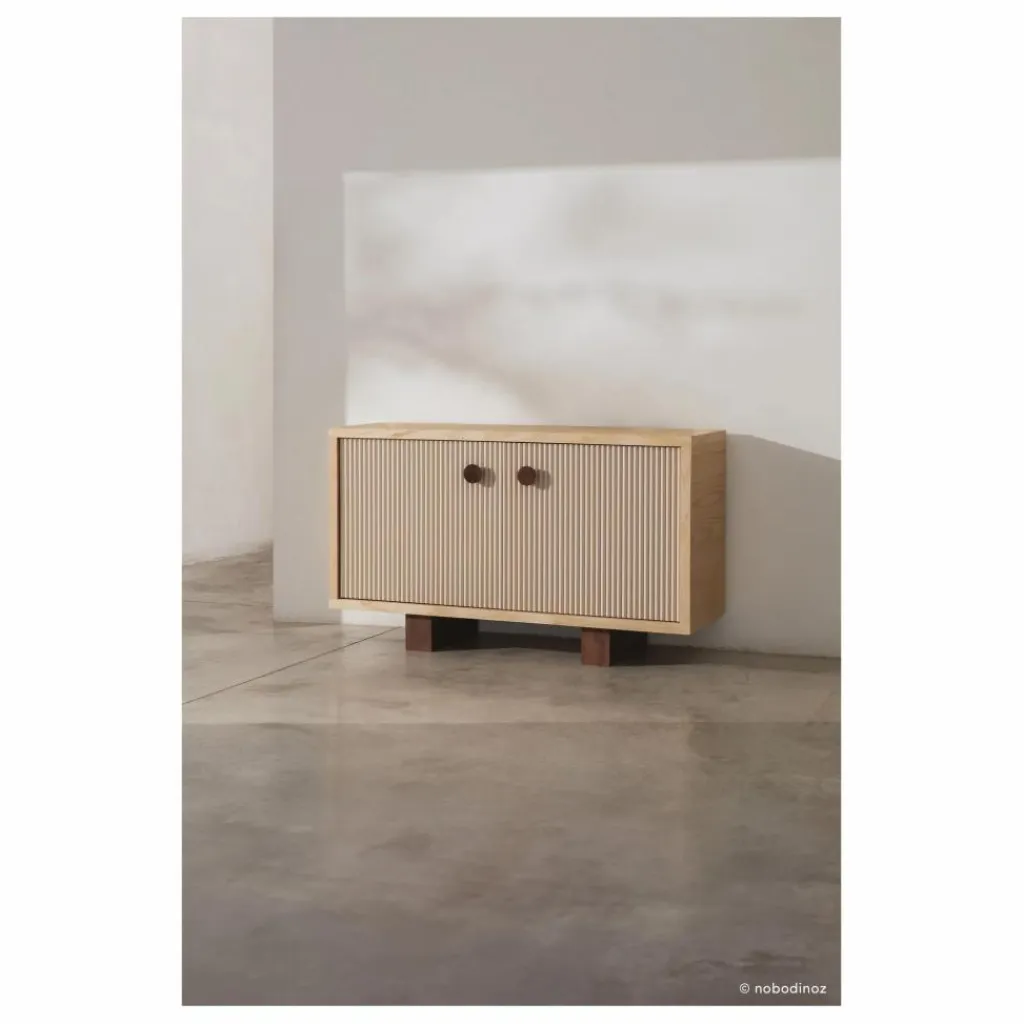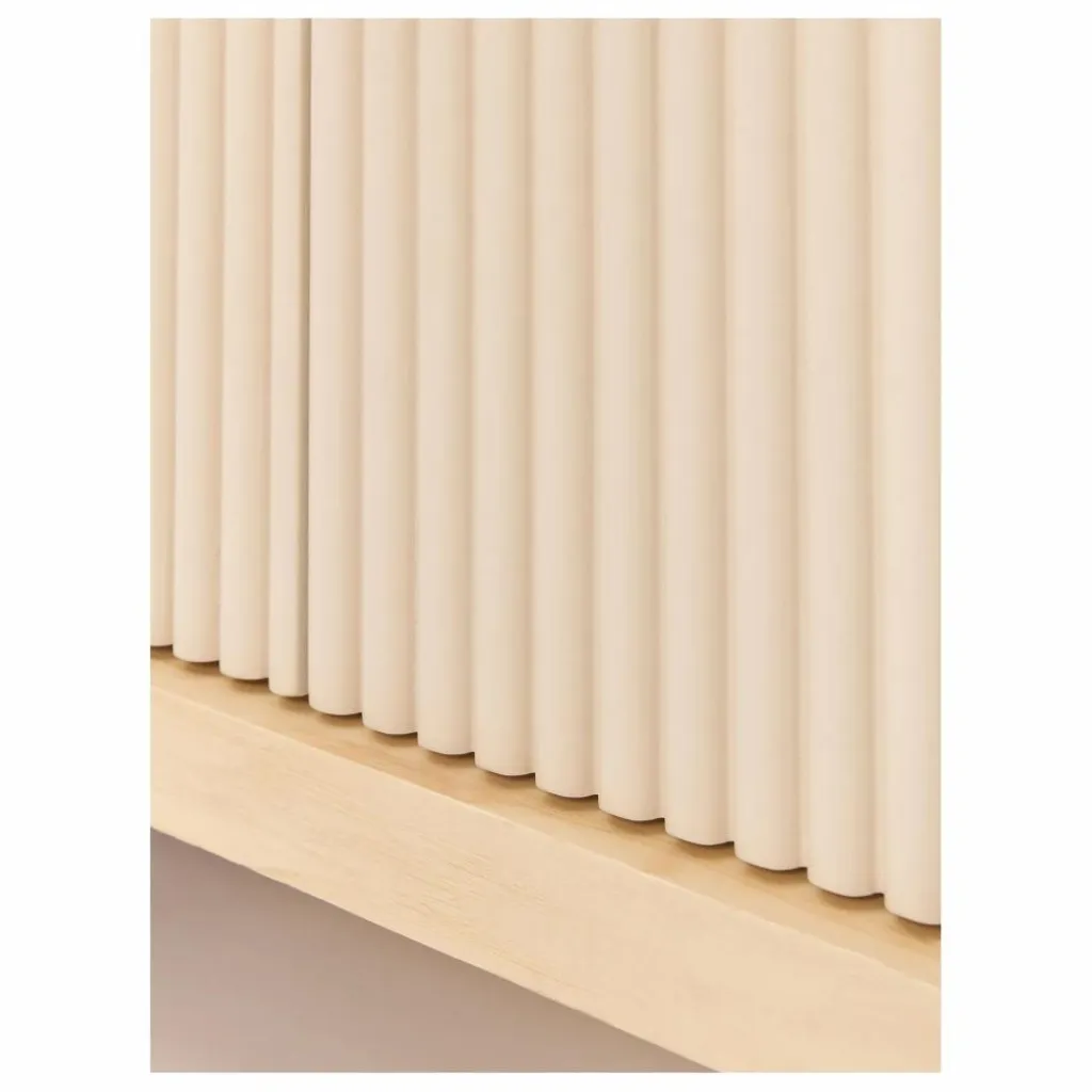 Le buffet, une des pièces maîtresses de la collection, illustre à la perfection les jeux d’ombres et de lumières grâce à ses portes dotées de fins godrons texturés. Ce geste esthétique se transforme en une expérience ludique pour les enfants, qui prennent plaisir à explorer les reliefs du bout des doigts.