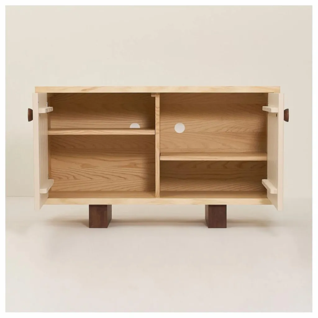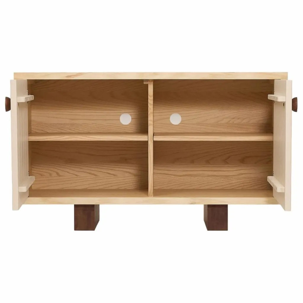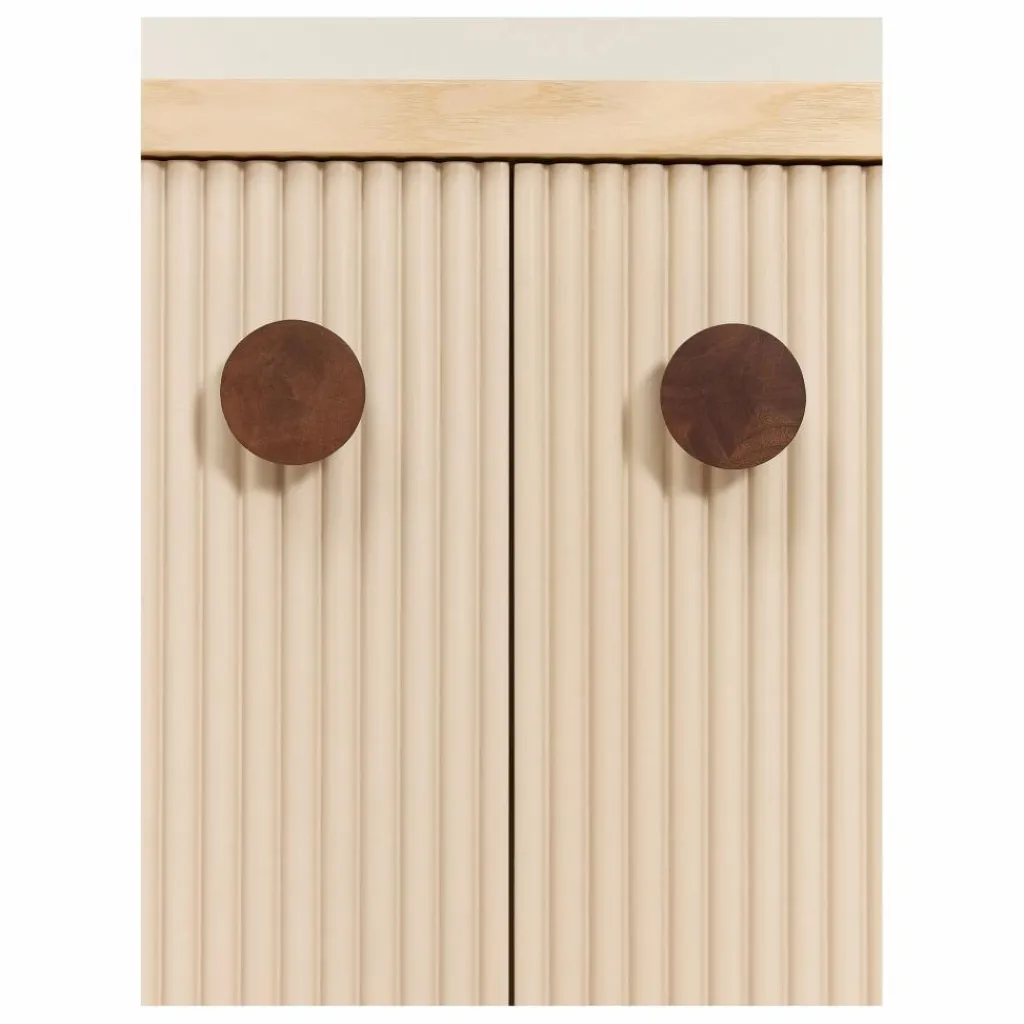 Le buffet, une des pièces maîtresses de la collection, illustre à la perfection les jeux d’ombres et de lumières grâce à ses portes dotées de fins godrons texturés. Ce geste esthétique se transforme en une expérience ludique pour les enfants, qui prennent plaisir à explorer les reliefs du bout des doigts.