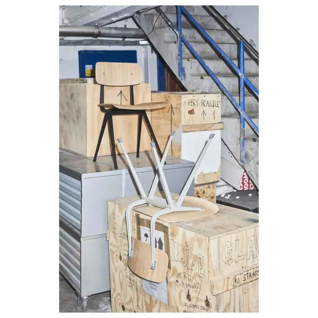 La chaise Result rééditée de son originale créée dans les années 50 par Friso Kramer et Wim Rietveld, a un vrai design rétro qui s’accorde parfaitement avec la table Pyramid. Flexible, légère et robuste, elle offre un vrai confort.