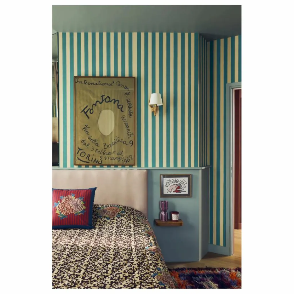 L’union de deux des motifs les plus emblématiques de Lisa Corti a donné naissance au motif Arabesque Corolla, où « Arabesque » provient d’un détail d’une miniature indienne : le motif décoratif de la veste d’un portrait de maharaja, retravaillé et transformé, conserve les proportions d’un dessin géométrique, qui sert de jardin à la fleur « corolla », qui est un bouquet de trois fleurs de Dahlia. Cette collection a demandé à Lisa Corti de se lancer dans une nouvelle technique d’impression très excitante. Cette technologie innovante est unique car le motif imprimé provient d’un prototype sculpté à la main par un héros, créé à l’aide de l’impression à la planche et fabriqué par des maîtres artisans en Inde, qui est ensuite copié sur du coton pur. Fabriquée exclusivement en Italie, cette nouvelle pratique à la fois artisanale et moderne incarne la fusion de l’héritage et de l’innovation de Lisa Corti.