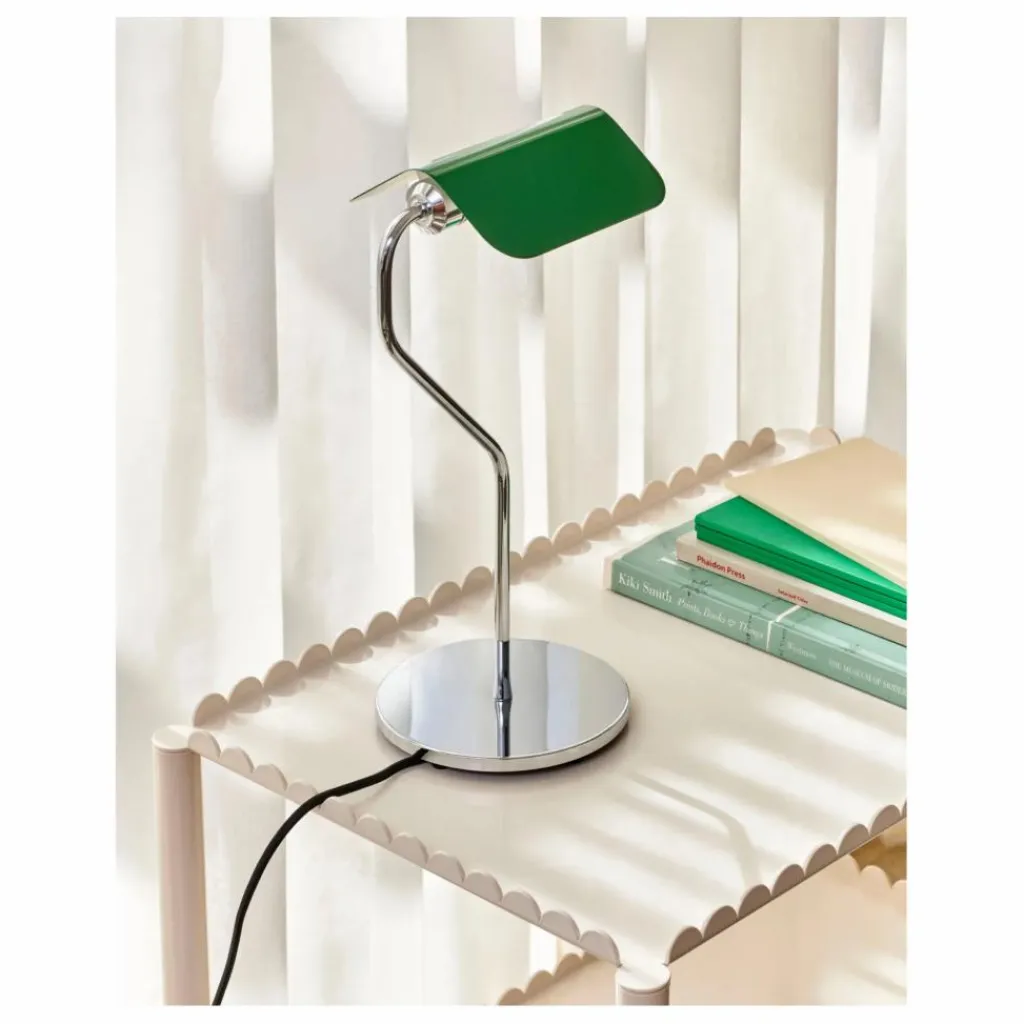 Cette série de lampes s’inspire de la fameuse Banker’s Light. Le designer leur donne ici une touche contemporaine avec des abat-jour en forme de toits pointus et une base chromée minimaliste.