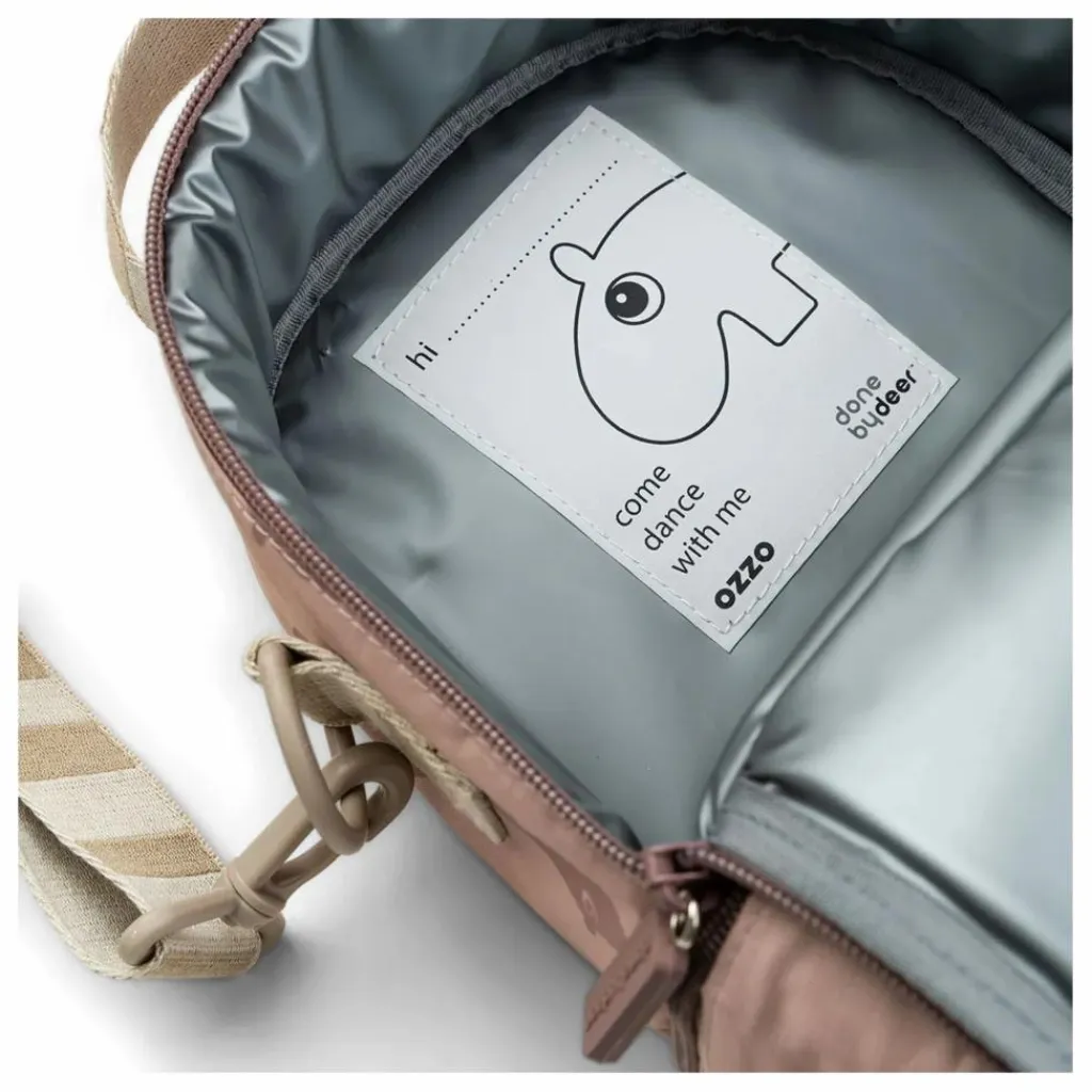 - Le lunchbag Ozzo est parfait pour garder le goûter ou des boissons bien au chaud ou au frais. Il est fabriqué en 100% polyester avec un tissu isolant à l’intérieur. Ce sac est idéal pour toutes les lunch boxes et bouteilles de Done by Deer. Le sac a deux compartiments et une sangle d’épaules ajustable. Grâce à ces deux zips, il est facile à ouvrir pour un enfant. Sur l’étiquette permettant d’inscrire le nom de votre enfant, Ozzo invite ce dernier à danser avec lui. Le sac isotherme est dans un joli rose tout imprimé de Ozzo, l’hippopotame. Les sangles ont les rayures signature de Done by Deer en beige. Le tissu durable est résistant à l’eau et facile à nettoyer avec un chiffon humide.