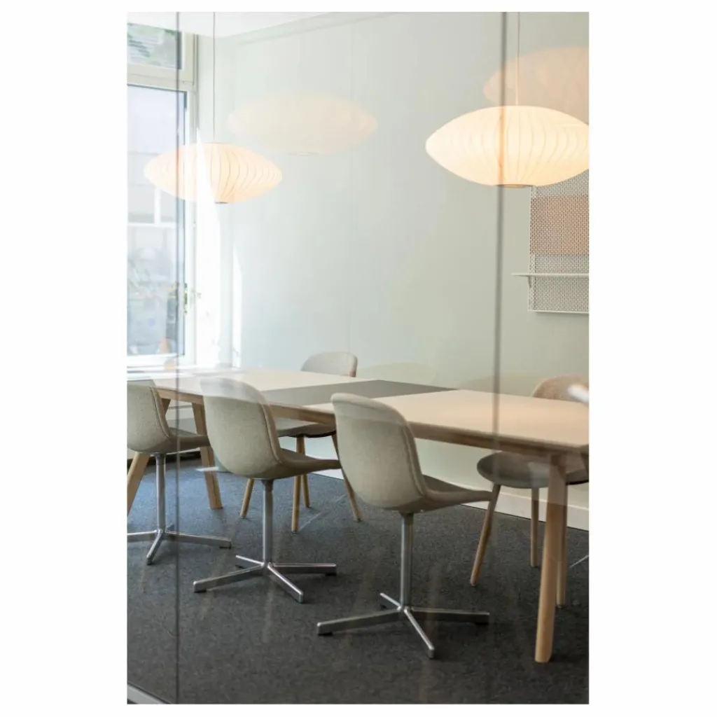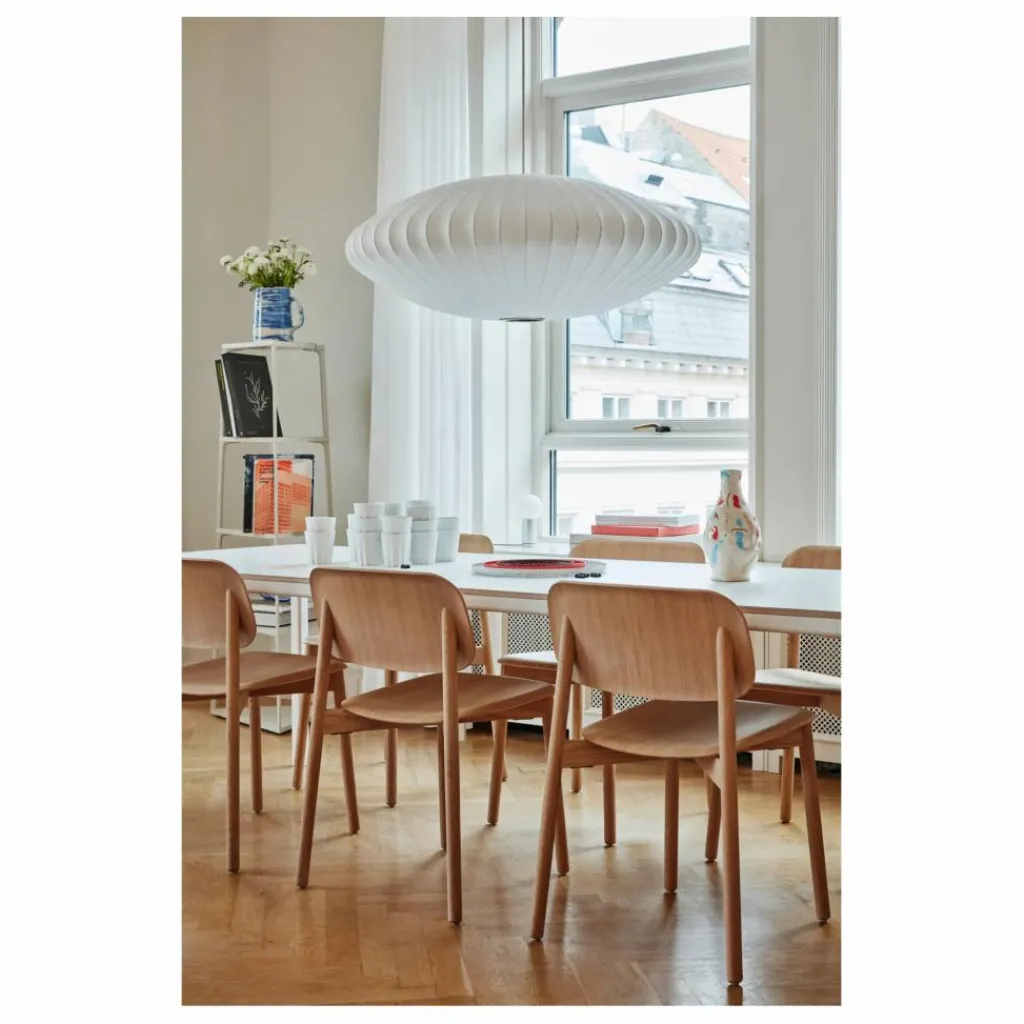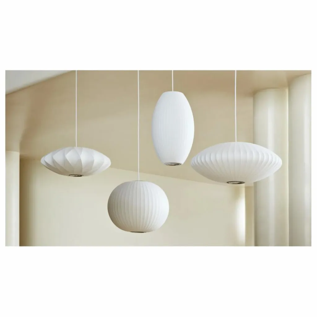 La large surface de la lampe diffuse une lumière douce dans tous les intérieurs. Elle est livrée avec une plaque de suspension en acier, ce qui lui permet de flotter délicatement au-dessus de votre tête. George Nelson a initialement conçu la série « Bubble Lamp » en 1952, inspirée d’un ensemble de suspensions suédoises recouvertes de soie.