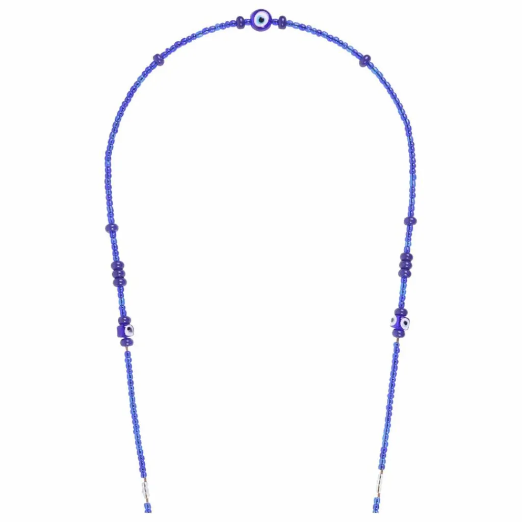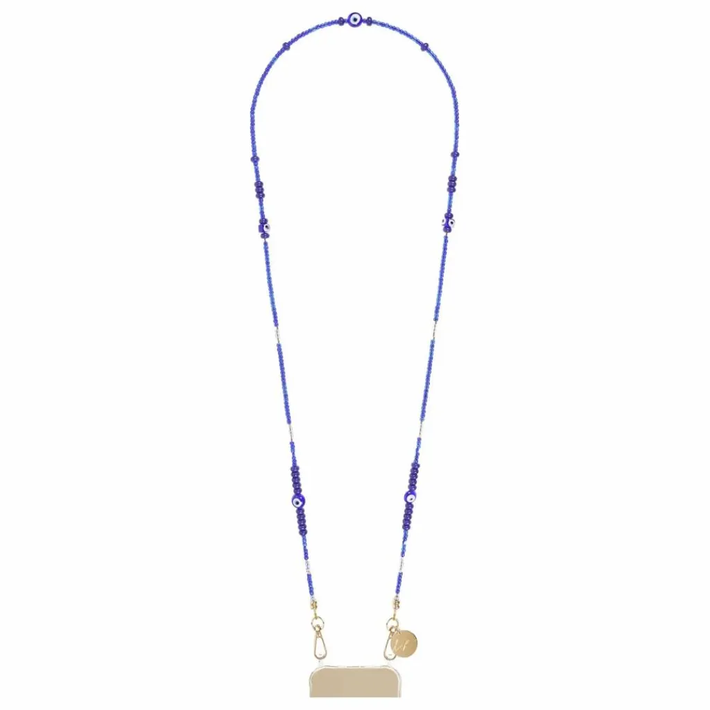 - Notre chaîne de téléphone Leda, en perles de verre teinté bleu profond, oeil de Mataki, longue de 120 cm, se clipse sur nos coques à anneaux ou notre adaptateur avec ses mousquetons dorés.