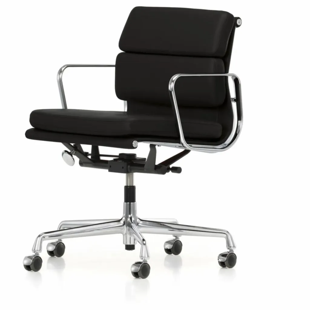 - Cette superbe chaise de bureau en cuir sera parfaite pour votre espace de travail. Le modèle EA 217 est un siège de bureau pivotants de la famille de sièges Soft Pad Group des designers Charles et Ray Eames. De par son esthétique discrète, ils convient particulièrement aux espaces de direction. Le confort exceptionnel de ce siège résulte de l’effet combiné du mécanisme d’inclinaison s’adaptant au poids de l’utilisateur et du rembourrage moelleux.
