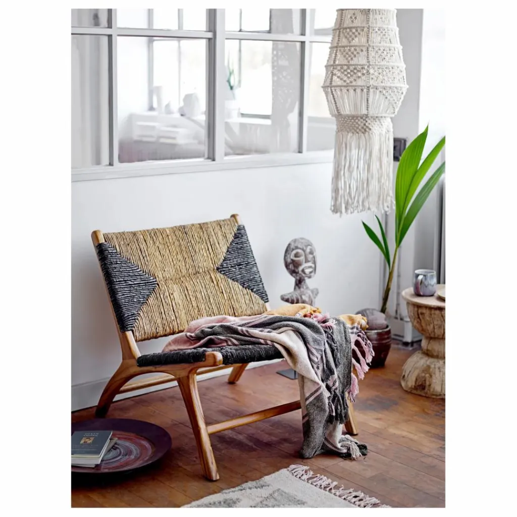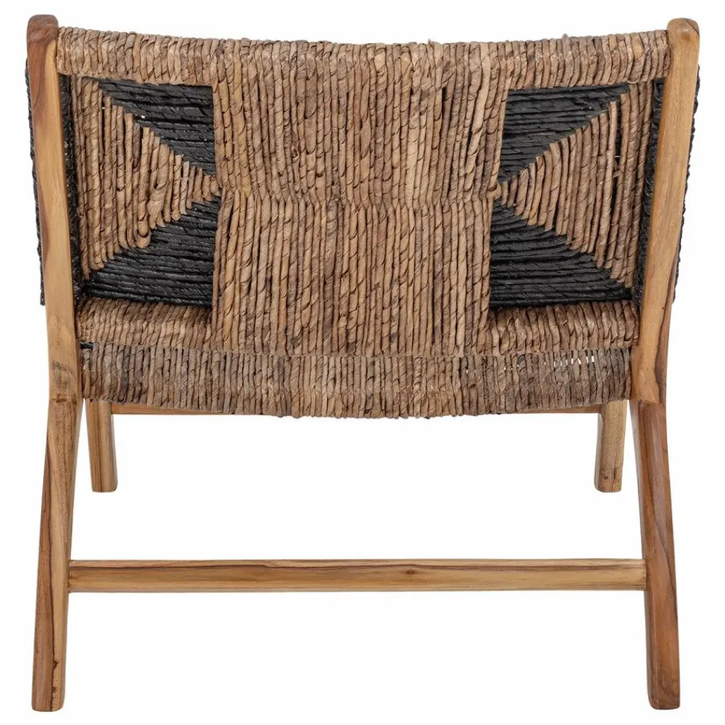 Cette jolie chaise à motifs graphiques est fabriquée en bois de teck robuste. Les cordes souples sont fabriquées à partir de feuilles de bananier et offrent un grand confort d’assise.