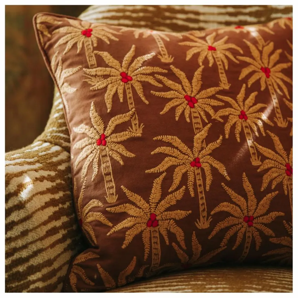 - Ce luxueux coussin, orné de palmiers brodés de façon complexe, évoque une élégance tropicale intemporelle, parfaite pour rehausser n’importe quel espace. L’artisanat détaillé ajoute de la profondeur et de l’art, transformant chaque coussin non seulement en un superbe accent décoratif, mais aussi en une retraite confortable pour se détendre et se relaxer. Cette housse de coussin est fabriquée à partir d’une toile de coton 100 % biologique. Le coton est une ressource naturelle et renouvelable, ce qui en fait un choix respectueux de l’environnement pour votre décoration intérieure.