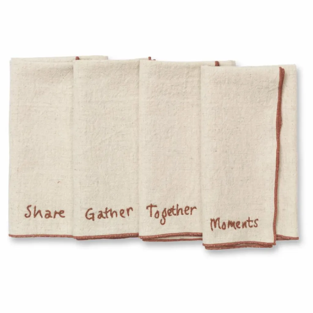 Célébrez le plaisir de manger avec les serviettes Occasion. Présentant des mots délicatement brodés qui rendent hommage à l’acte de se réunir pour un repas, ces serviettes rehaussent l’ambiance feutrée et douce de votre table.