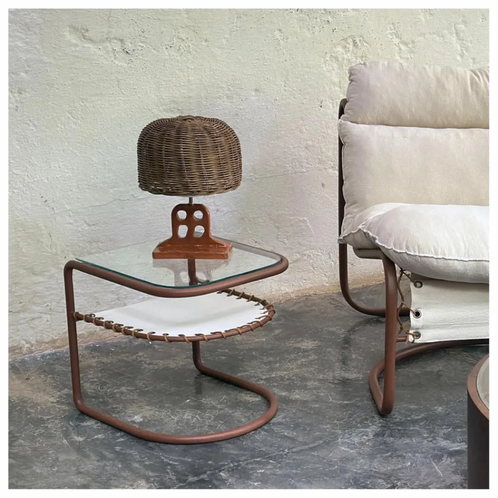 - En version indoor, la tablette Campo joue la carte de l’élégance discrète. Avec sa structure tout en courbe et son plateau en verre, cette table d’appoint adore être accompagné par le fauteuil Campo Indoor pour un duo aussi beau qu’inséparable.