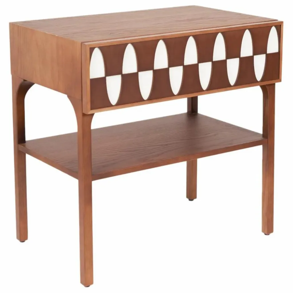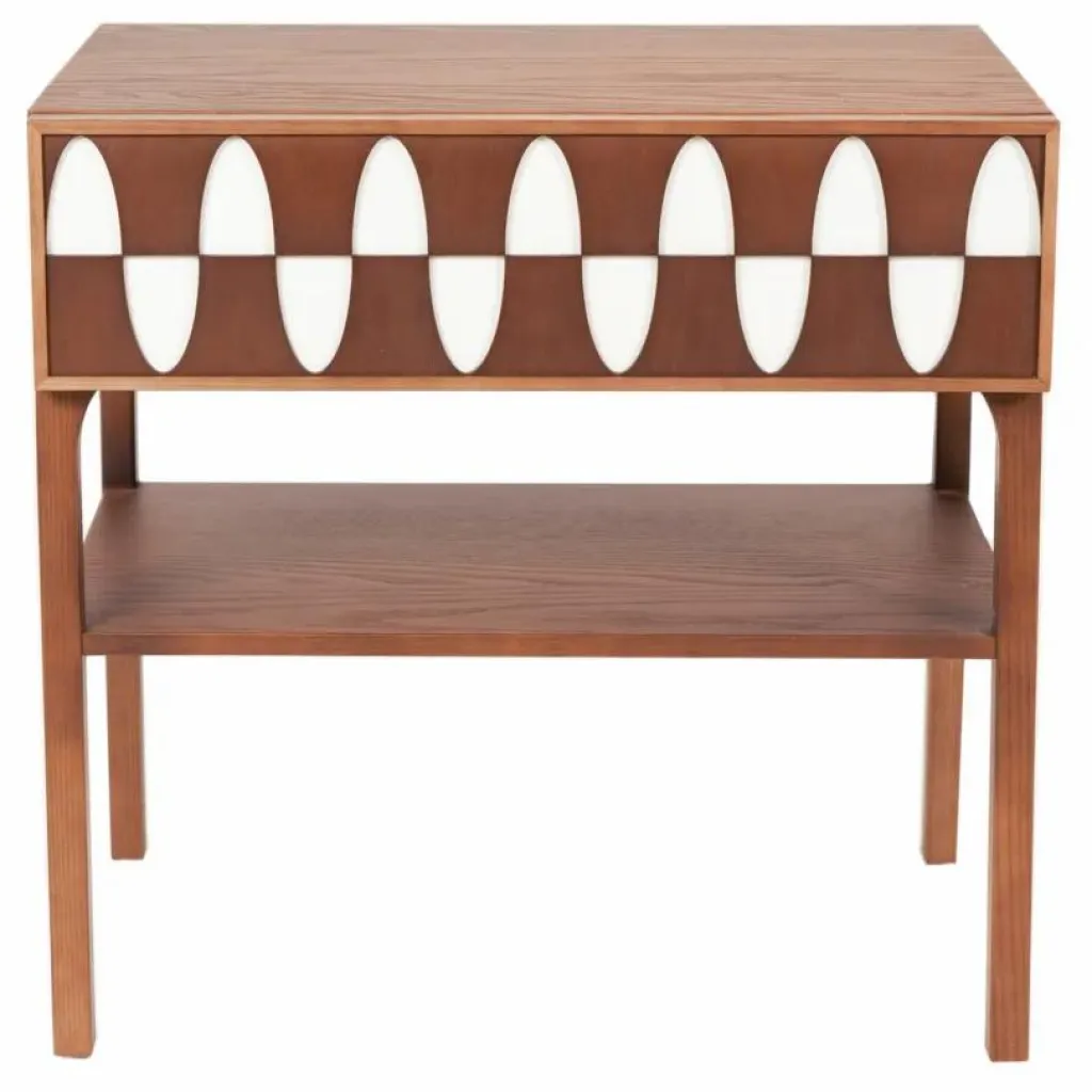 - S’inspirant d’un motif de vague, la table de chevet Écailles mêle design et artisanat pour créer un objet unique. Entre formes géométriques et détails subtils, l’assemblage des deux teintes de bois et la finesse des pieds en font un véritable objet de décoration, à placer dans une chambre ou dans un salon.