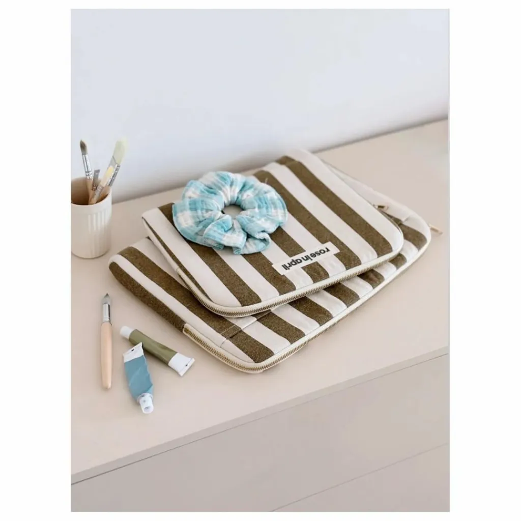- OCTAVE POCHETTE COLORIS RAYURE OLIVE/ GREIGE EFFET LAVE DOUBLURE EN COTON ENDUIT 100% COTON TAILLE : 13/14′ FABRIQUE AU PORTUGAL CERTIFIE OEKO TEX