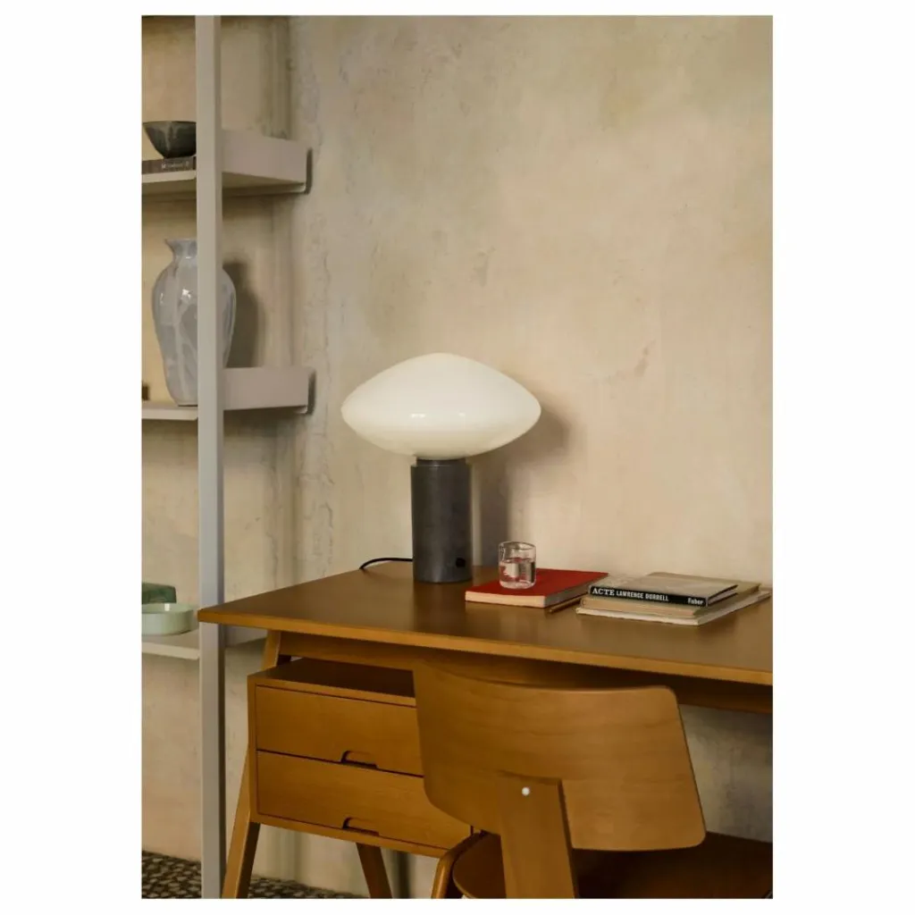 - Centrée autour d’un abat-jour en verre opale soufflé à la bouche, la lampe de table Mist est dotée d’un pilier en marbre massif et d’un gradateur discret. Le contraste frappant entre les matériaux se traduit par un design gracieux à la présence subtile et raffinée.