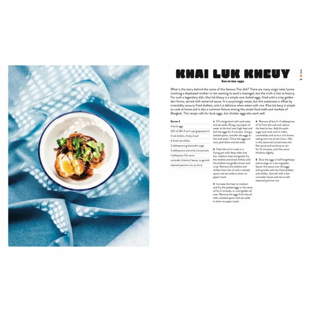 Dans le premier chapitre, par exemple, vous pouvez préparer des œufs de gendre (Khai luk kheuy), un gâteau de taro frit (Khanom peuak tod), des bananes frites (Gluay tod) ou des boulettes de haricot mungo sucrées (Khanom tua paep). Et ce n’est que le tout début de votre voyage.