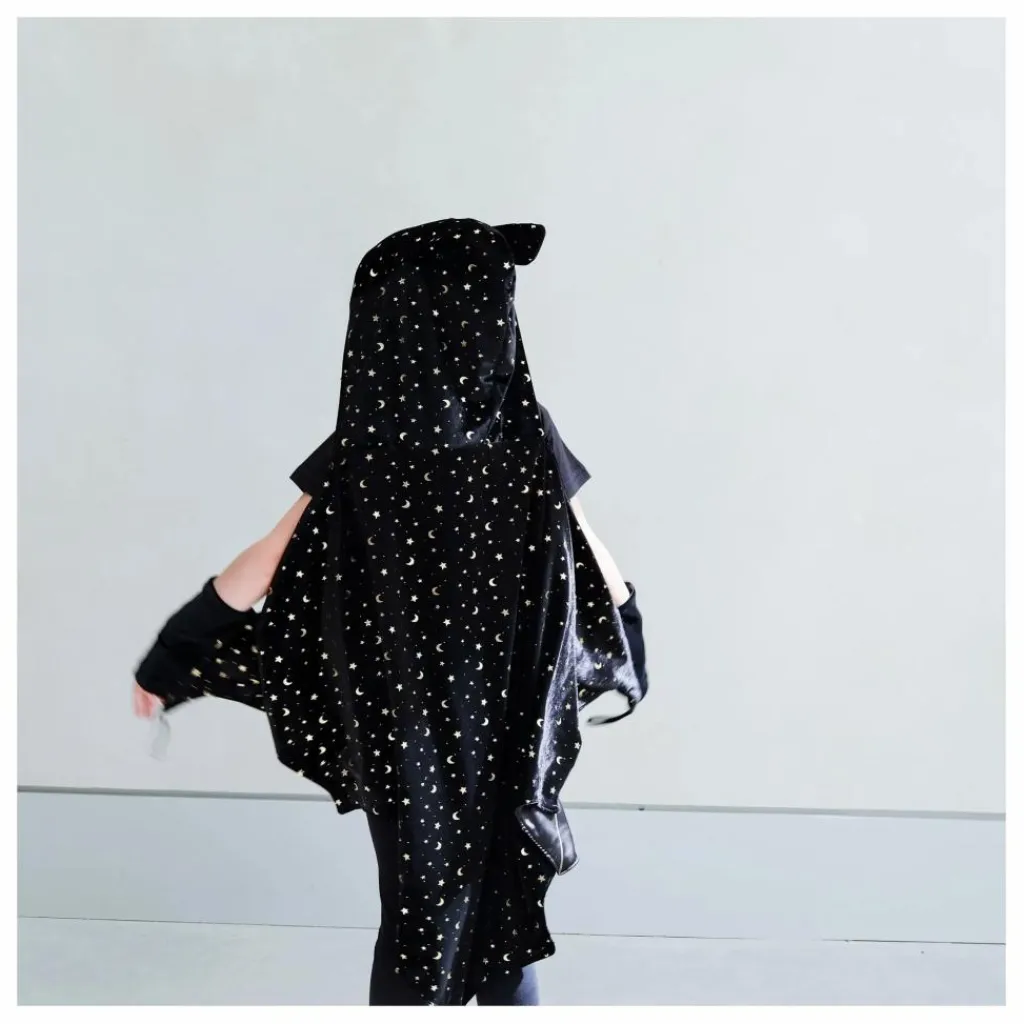 - Entrez dans la saison effrayante avec style grâce à cette cape de chauve-souris en velours noir super doux ! Ornée de lunes et d’étoiles en feuille d’or, cette cape à capuche ludique est parfaite pour toutes les célébrations d’Halloween !