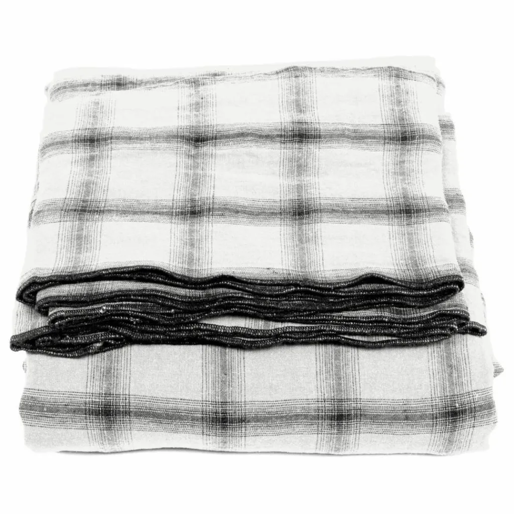Cette nappe, au motif tartan et aux coutures apparentes, est souple et douce au toucher.