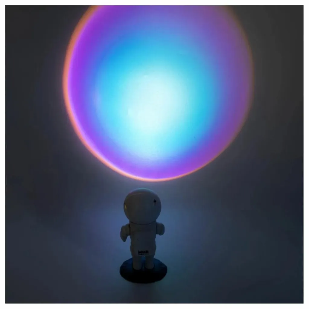Cette lampe nomade au design d’astronaute diffuse une douce lumière relaxante aux couleurs du coucher de soleil ou d’une aurore boréale. Elle est particulièrement recom- mandée pour les chambres d’enfants comme veilleuse spatiale.