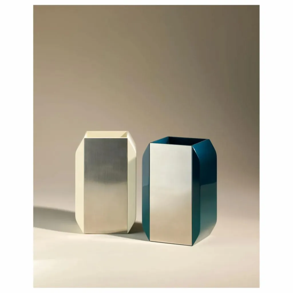 - En bois laqué et inox brossé, ce vase arbore une couvrance laquée haute brillance (Bleu Sarah ou Écru) signée de main de maître, celle d’Hanoia, un savoir-faire vietnamien ancestral réputé.