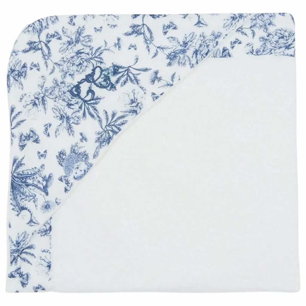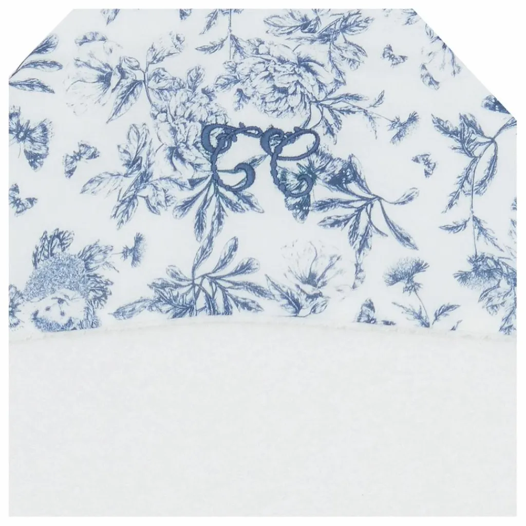 - Cape de bain blanche, bordée de l’imprimé Toile de Jouy bleu dessiné par Tartine et Chocolat.
