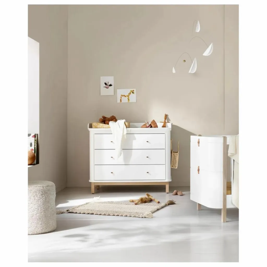 - La commode à langer 3 tiroirs Wood sont fabriquées en MDF. Les pieds et patères sont en chêne huilé blanc.