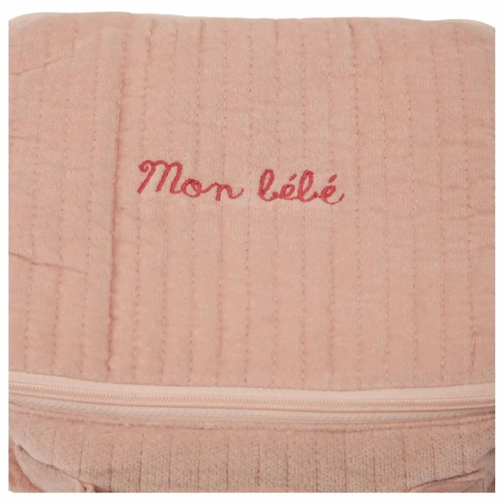 - Trousse de naissance en velours de coton rose molletonnée. Une broderie rose » Mon Bébé » égaye le dessus de la mallette.
