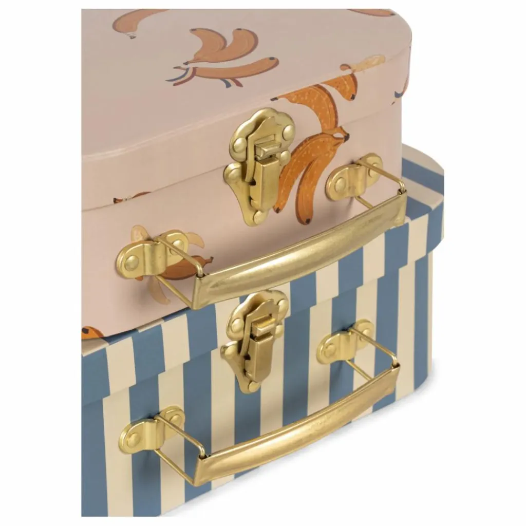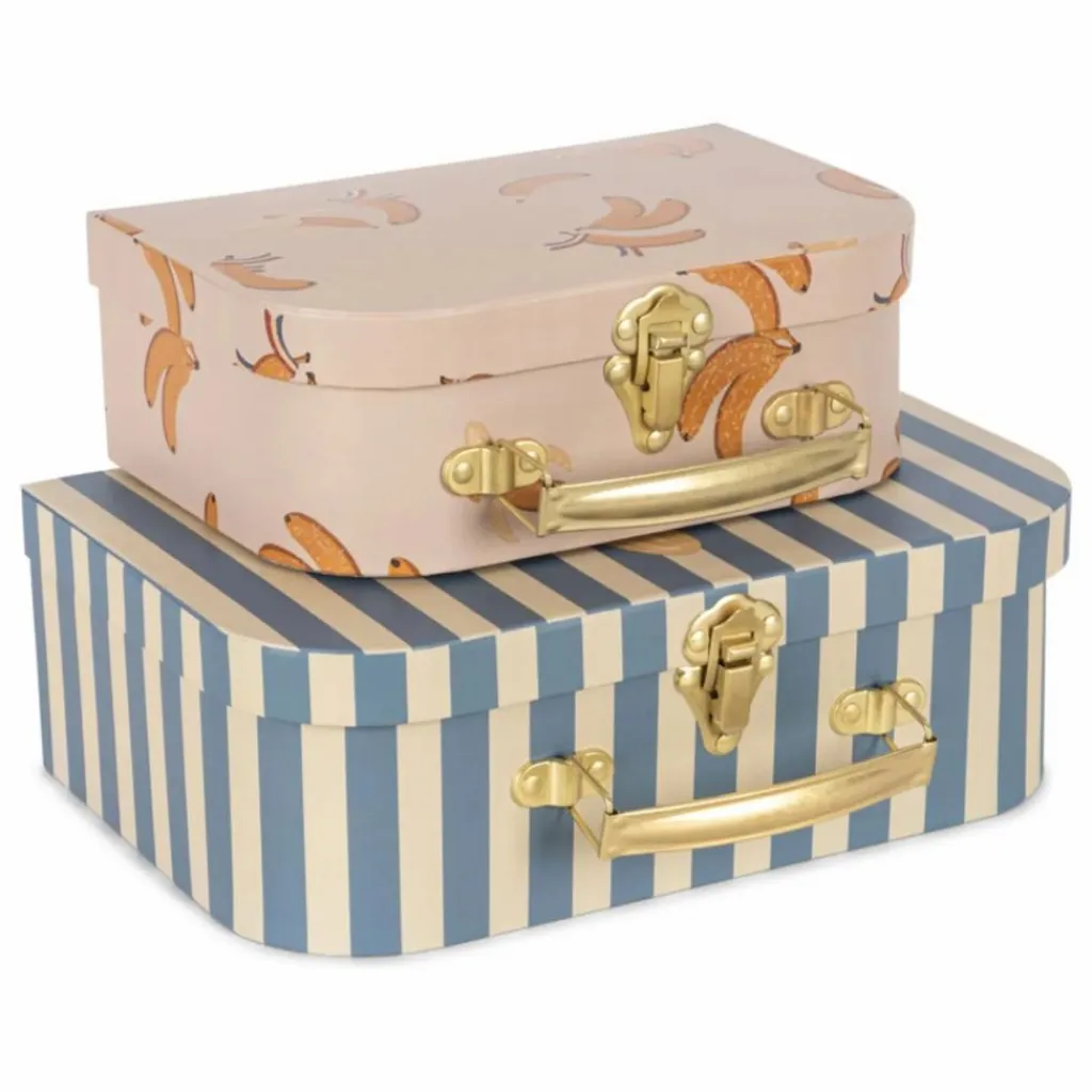 - Jeu de deux valises en carton avec poignée en métal. La plus petite valise s’insère dans la plus grande. Un endroit parfait pour ranger les petits trésors.