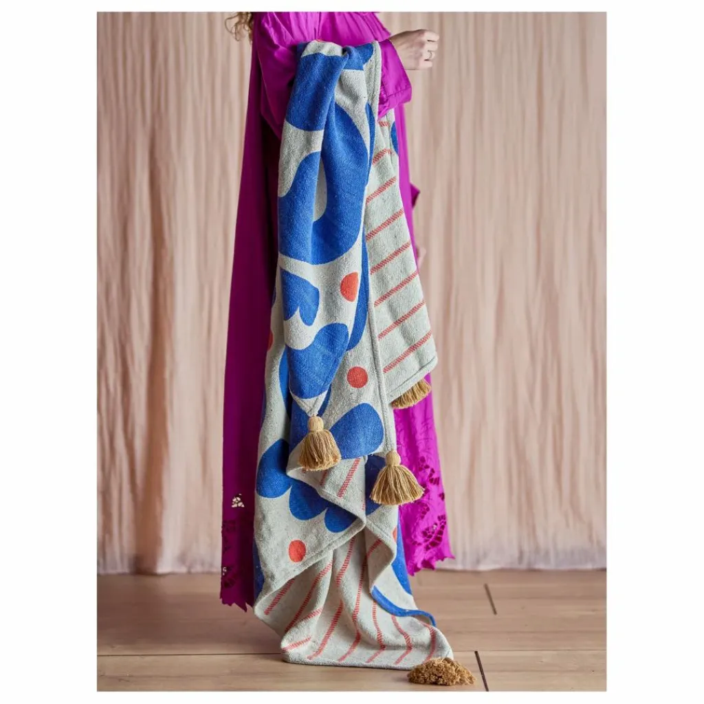 - Le Plaid Eviaya de Bloomingville est un plaid décoratif avec un motif de chaque côté. Le recto présente un motif délicat dans des tons de bleu et de rouge, créant un joli contraste. Le verso est orné de rayures rouges tissées. Chaque coin est décoré de pompons de couleur jaunâtre. Le plaid est fabriqué à partir de matériaux recyclés, et sa texture douce en fait un accessoire parfait pour des moments de détente sur le canapé.