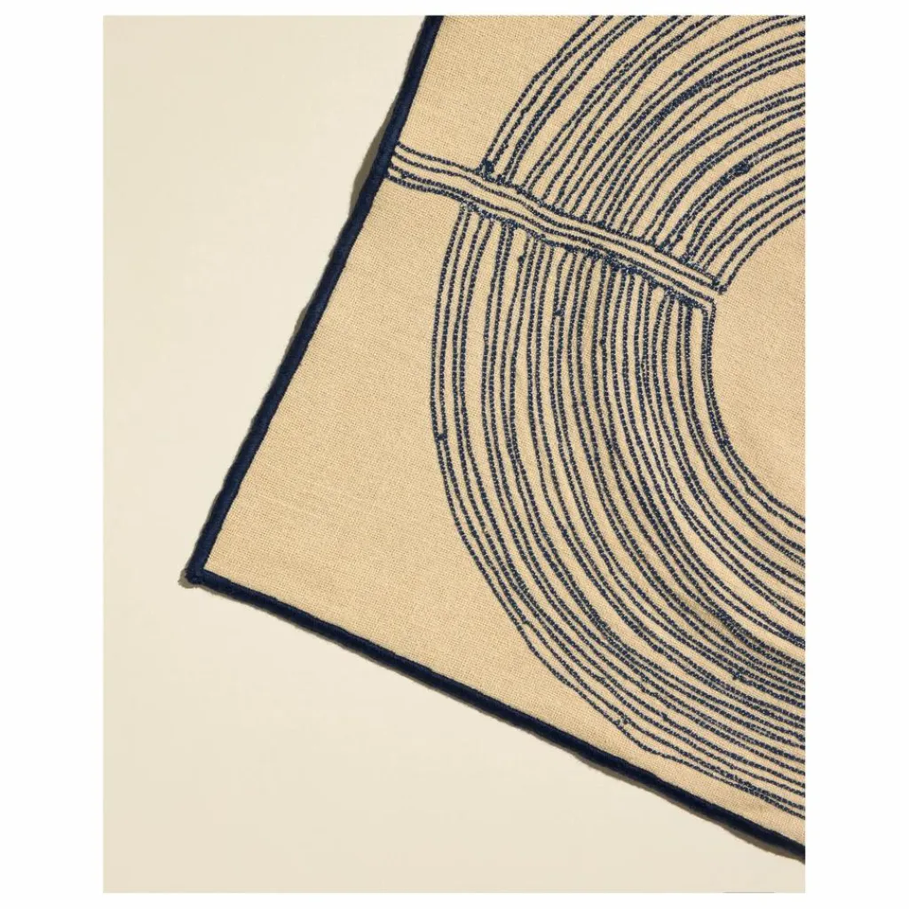 - Broderie couchée, elle consiste à poser un fil épais ou décoratif (dans ce cas, le fil coloré) sur le tissu, sans le faire passer à travers, puis à le fixer à l’aide de petits points de broderie (ici en écru) réalisés avec un autre fil.