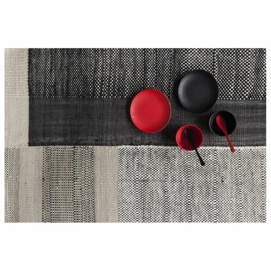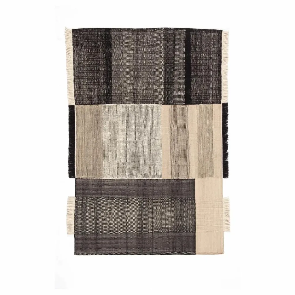 Tres est un tapis indien traditionnel à tissage plat Dhurrie. Sa qualité unique réside dans la production de trois pièces indépendantes dans lesquelles différentes fibres prédominent.La proportion et la combinaison de laine, de feutre et de coton génèrent des changements de ton et d’irrégularités dans le tissage, donnant vie au motif.