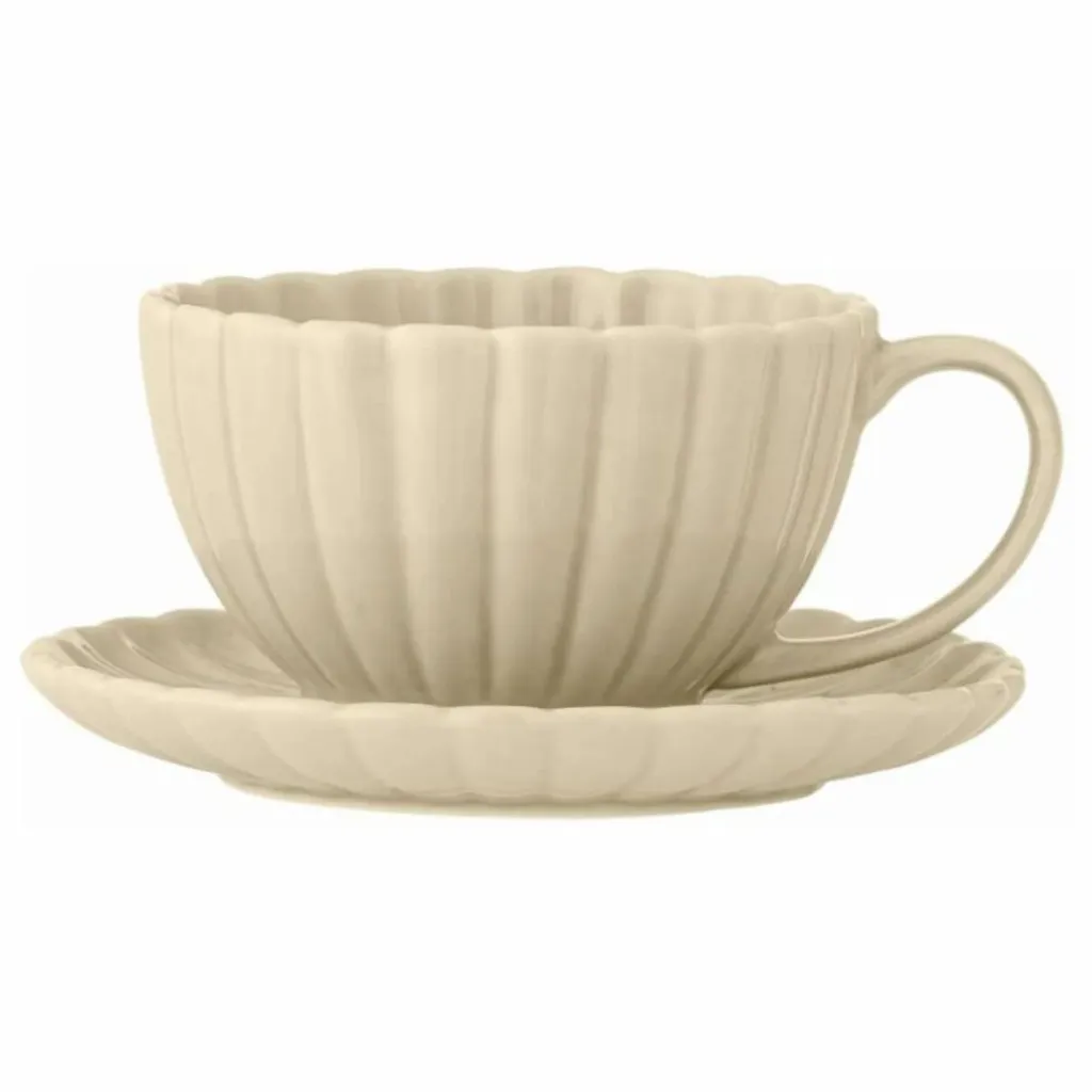 - La Tasse Latina avec soucoupe de Bloomingville est un magnifique ensemble composé de deux pièces. L’ensemble est fabriqué en grès et émaillé dans une teinte beige. Les bords ondulés ajoutent à la fois de la texture et une touche élégante au design. La glaçure peut entraîner des variations de couleur, donnant à chaque ensemble son propre caractère unique.