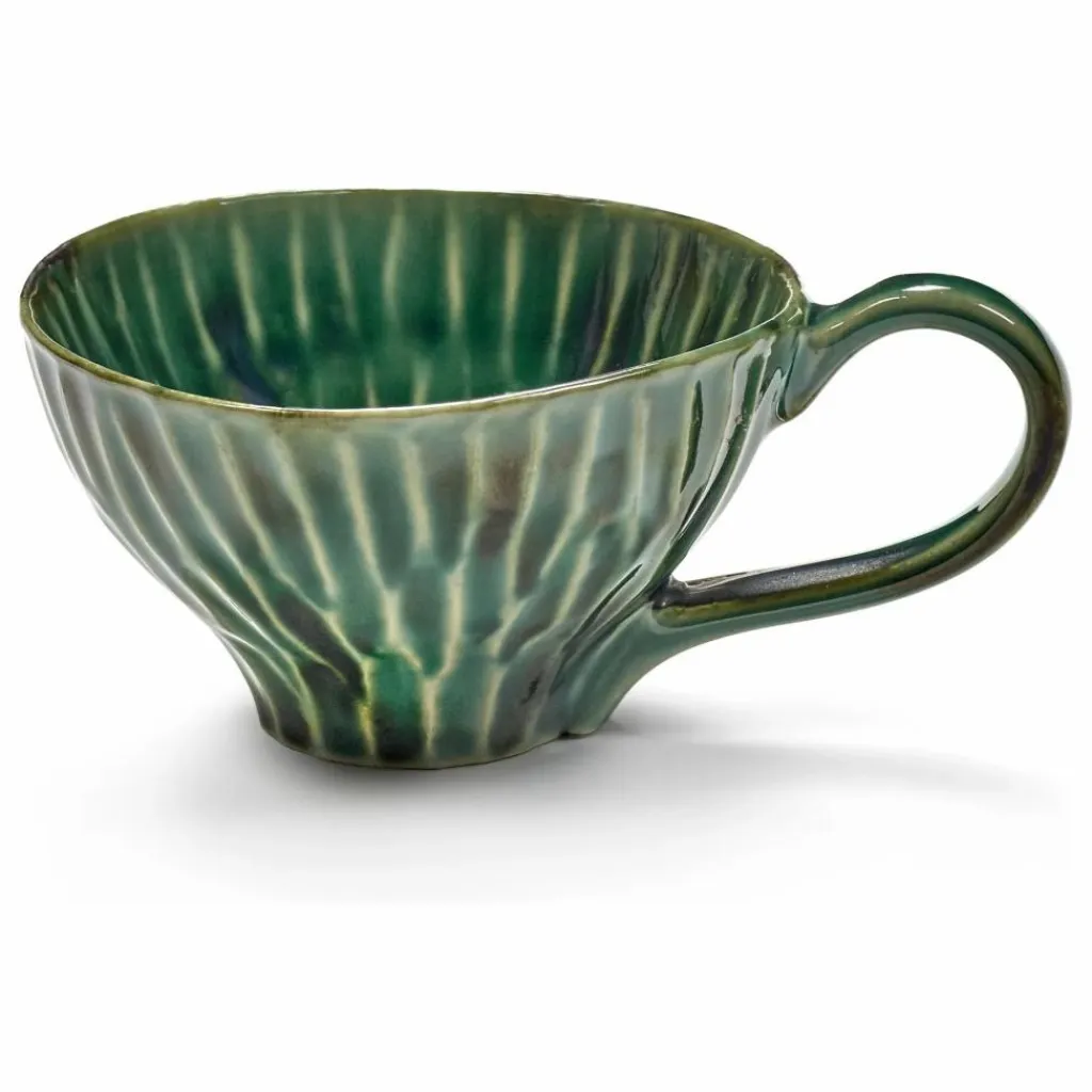 - Pour son dernier livre « Eén Pan », Naessens n’a pas seulement pris la plume, elle est aussi retournée dans son atelier de céramique. Elle a personnellement créé la collection « Verde Lanza », désormais produite en exclusivité par Serax. Le nom fait référence à l’île de Lanzarote, où Naessens réside souvent. Elle s’y est inspirée du vert des fenêtres et des portes en bois, ainsi que des rares plantes qui se détachent sur le paysage lunaire noir. Le vert délavé par le soleil – une teinte qui se marie à merveille avec tout ce qui est délicieux – est rehaussé par la texture en forme de coquillage que Naessens a appliquée avec ses doigts. En bref : cent pour cent Pascale et autant de soleil.