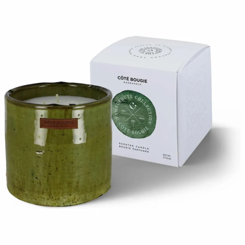 - La Bougie parfumée Tamegroute Verte célèbre l’héritage artisanal du sud marocain. Ses irrégularités, comme les traces sombres visibles sur trois côtés (qui peuvent donner l’impression d’une cassure), sont en réalité la preuve d’une véritable poterie de Tamegroute. Ces marques proviennent de la cuisson dans des fours ancestraux et de l’émail naturel à base de cuivre et de manganèse, rendant chaque pièce absolument unique.