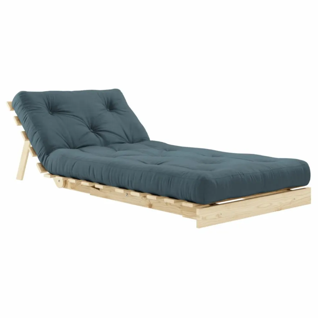 Ce canapé Roots se transforme aussi bien en lit qu’en chaise longue confortable. En abaissant les pieds avant et en ajustant le dossier, vous obtenez une chaise longue confortable. En abaissant complètement le dossier, vous obtenez un lit agréable. En doublant le dossier, en rabattant le matelas, vous obtenez une chaise longue de hauteur normale.