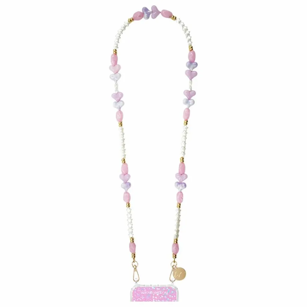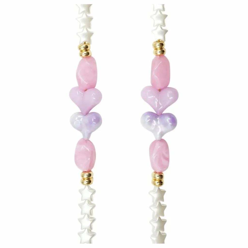 - Chaîne bijou Ana 100 cm etoiles nacrées et cœur violet avec mousquetons dorés.