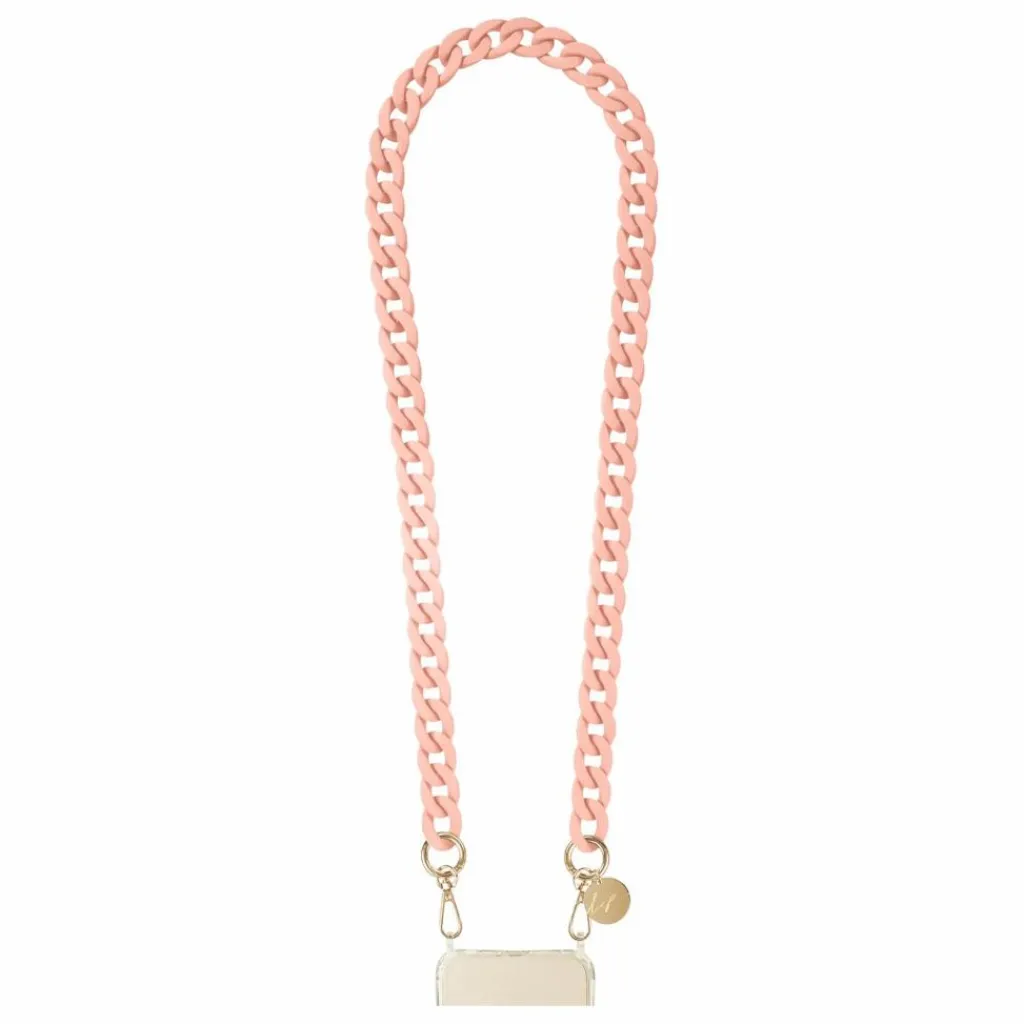 - Chaîne de téléphone « Sarah », 100 cm, rose pâle, résine. Mousquetons rotatifs dorés, médaille gravée « LCF » doré. Chacune de nos chaines est livrée avec un pochon réutilisable en coton recyclé contre la poussière ou pour rangement