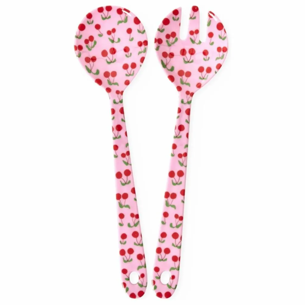 - Cuillère et fourchette à salade en mélamine avec impression de cerises roses