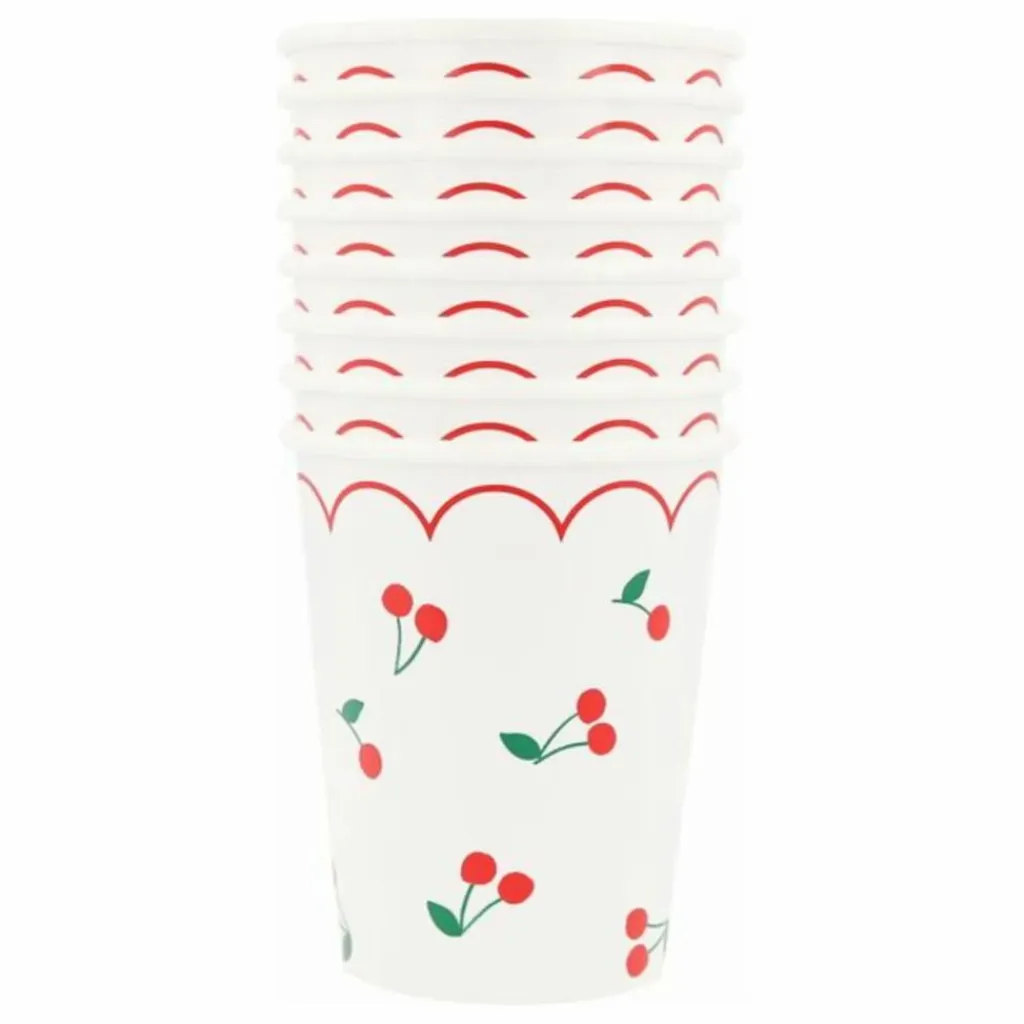 - Estivales et amusantes… les cerises sont le design incontournable pour donner un nouveau look à vos soirées. Ces jolis gobelets en papier à motifs, avec des détails festonnés rouges, donneront un effet élégant à toutes les boissons que vous servez. Ils sont idéaux pour les garden-partys, les pique-niques ou chaque fois que vous souhaitez une touche vibrante.