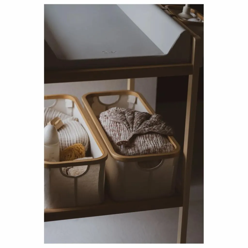 - Ce panier de rangement, spécialement conçu pour nos tables à langer, allie élégance et fonctionnalité. Fabriqué en bambou et coton de haute qualité, ce panier offre une manière naturelle et durable de garder tous les essentiels de bébé bien organisés. Avec des dimensions de 24x60x18 cm, il s’intègre parfaitement avec nos tables à langer, maintenant toutes les nécessités à portée de main. Gardez la chambre de bébé bien organisée et ajoutez une touche de style avec ce panier de rangement pratique.