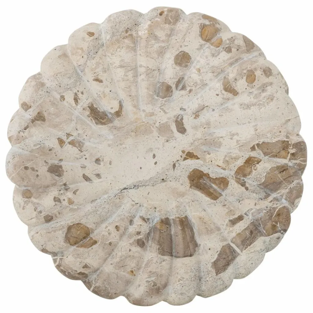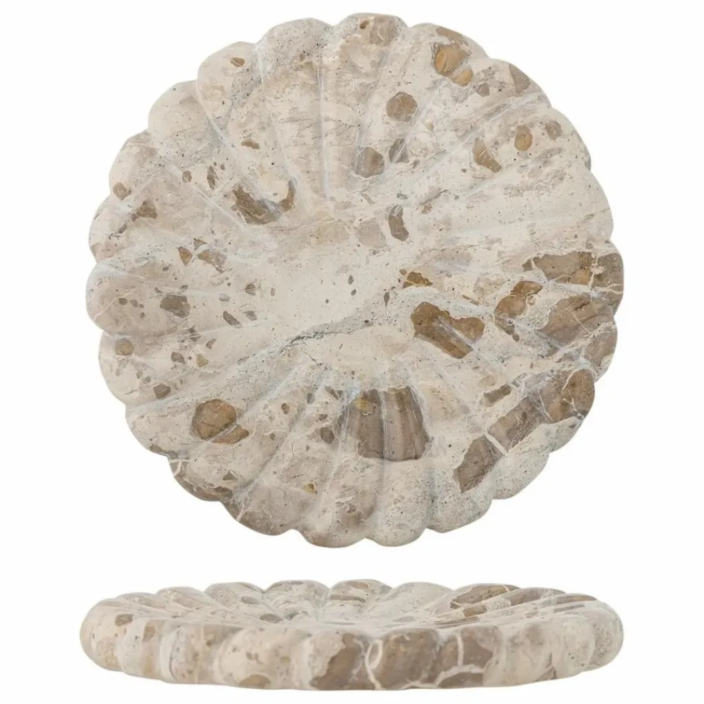 - Le Plateau Marlie de Bloomingville est fabriqué en marbre et présente une forme douce et ronde avec des détails sculptés. La variation naturelle de la couleur et de la texture de la pierre rend chaque plateau unique et lui confère un aspect organique.